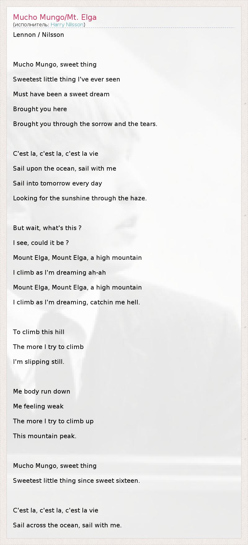 А как ты думаешь, о чем песня "Mucho Mungo/Mt. Elga" ?