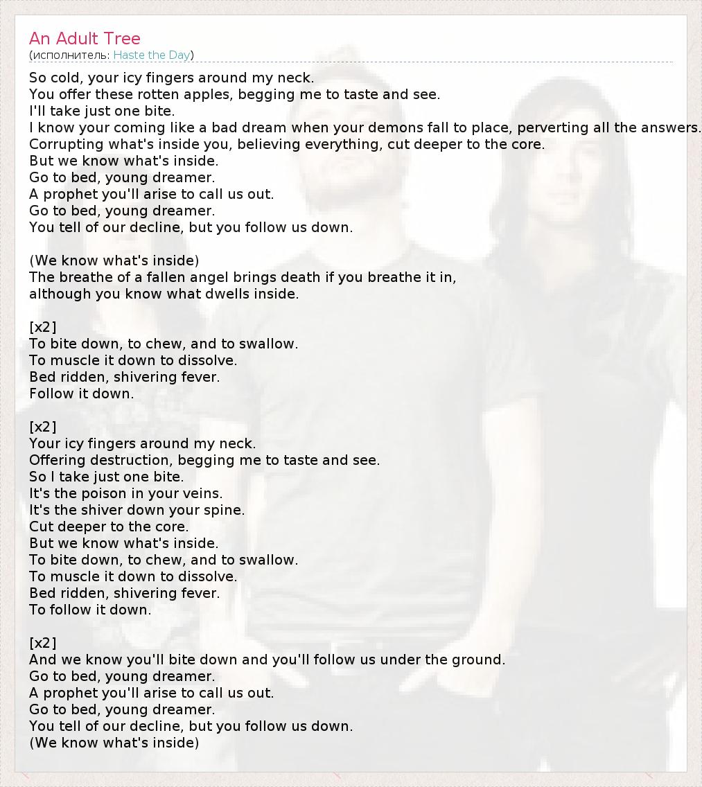 So cold, your icy fingers around my neck. You offer these rotten apples, begging me to taste and see. I'll take just one bite. I know your coming like a bad dream when your demons fall to place, perverting all the answers. Corrupting what's inside you, believing everything, cut deeper to the core. But we know what's inside. Go to bed, young dreamer. A prophet you'll arise to call us out. Go to bed, young dreamer. You tell of our decline, but you follow us down. (We know what's inside) The breathe of a fallen angel brings death if you breathe it in, although you know what dwells inside. [x2] To bite down, to chew, and to swallow. To muscle it down to dissolve. Bed ridden, shivering fever. Follow it down. [x2] Your icy fingers around my neck. Offering destruction, begging me to taste and see. So I take just one bite. It's the poison in your veins. It's the shiver down your spine. Cut deeper to the core. But we know what's inside. To bite down, to chew, and to swallow. To muscle it down to dissolve. Bed ridden, shivering fever. To follow it down. [x2] And we know you'll bite down and you'll follow us under the ground. Go to bed, young dreamer. A prophet you'll arise to call us out. Go to bed, young dreamer. You tell of our decline, but you follow us down. (We know what's inside)