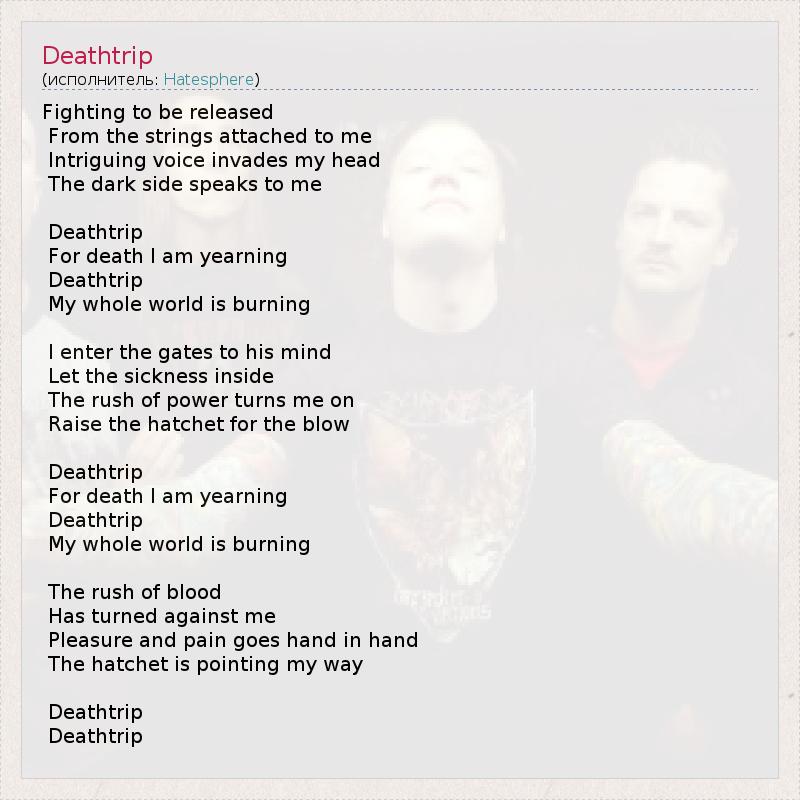 Fighting to be released From the strings attached to me Intriguing voice invades my head The dark side speaks to me Deathtrip For death I am yearning Deathtrip My whole world is burning I enter the gates to his mind Let the sickness inside The rush of power turns me on Raise the hatchet for the blow Deathtrip For death I am yearning Deathtrip My whole world is burning The rush of blood Has turned against me Pleasure and pain goes hand in hand The hatchet is pointing my way Deathtrip Deathtrip