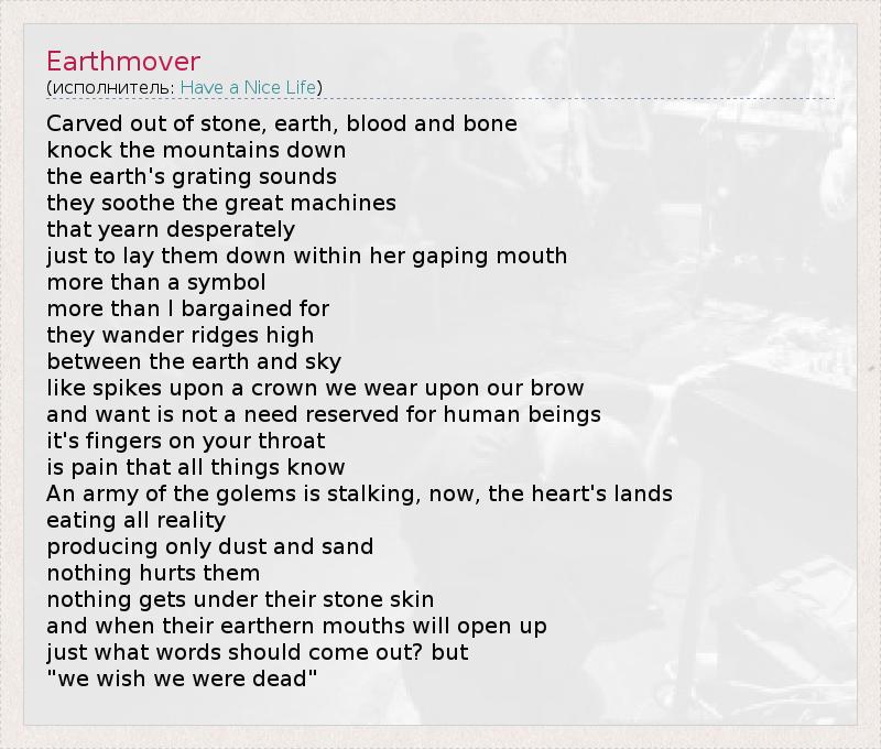 Carved out of stone, earth, blood and bone knock the mountains down the earth's grating sounds they soothe the great machines that yearn desperately just to lay them down within her gaping mouth more than a symbol more than I bargained for they wander ridges high between the earth and sky like spikes upon a crown we wear upon our brow and want is not a need reserved for human beings it's fingers on your throat is pain that all things know An army of the golems is stalking, now, the heart's lands eating all reality producing only dust and sand nothing hurts them nothing gets under their stone skin and when their earthern mouths will open up just what words should come out? but "we wish we were dead"