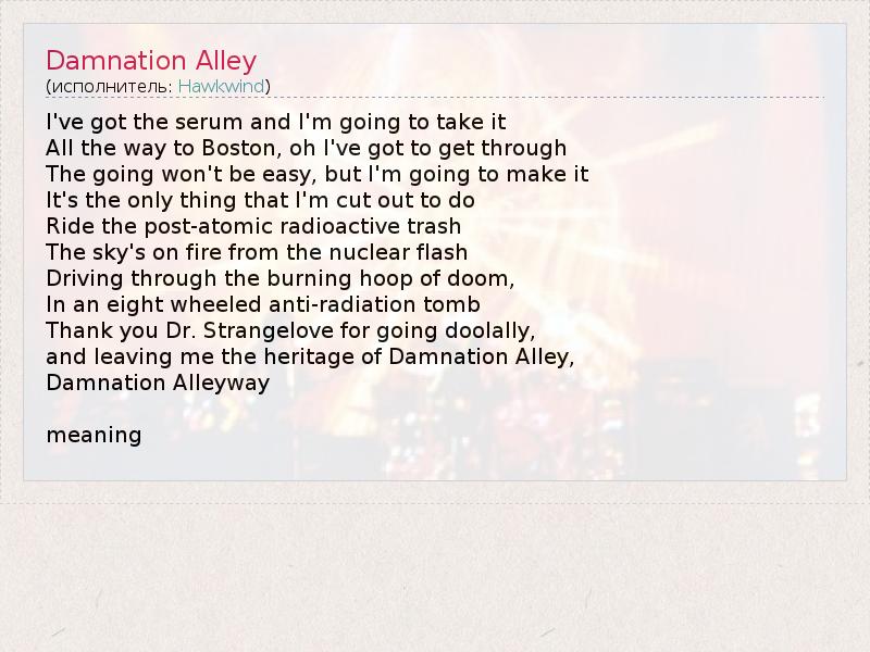 А как ты думаешь, о чем песня "Damnation Alley" ?