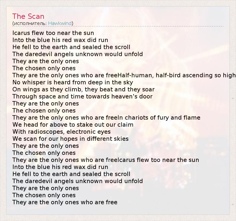 Icarus flew too near the sun Into the blue his red wax did run He fell to the earth and sealed the scroll The daredevil angels unknown would unfold They are the only ones The chosen only ones They are the only ones who are freeHalf-human, half-bird ascending so high No whisper is heard from deep in the sky On wings as they climb, they beat and they soar Through space and time towards heaven's door They are the only ones The chosen only ones They are the only ones who are freeIn chariots of fury and flame We head for above to stake out our claim With radioscopes, electronic eyes We scan for our hopes in different skies They are the only ones The chosen only ones They are the only ones who are freeIcarus flew too near the sun Into the blue his red wax did run He fell to the earth and sealed the scroll The daredevil angels unknown would unfold They are the only ones The chosen only ones They are the only ones who are free