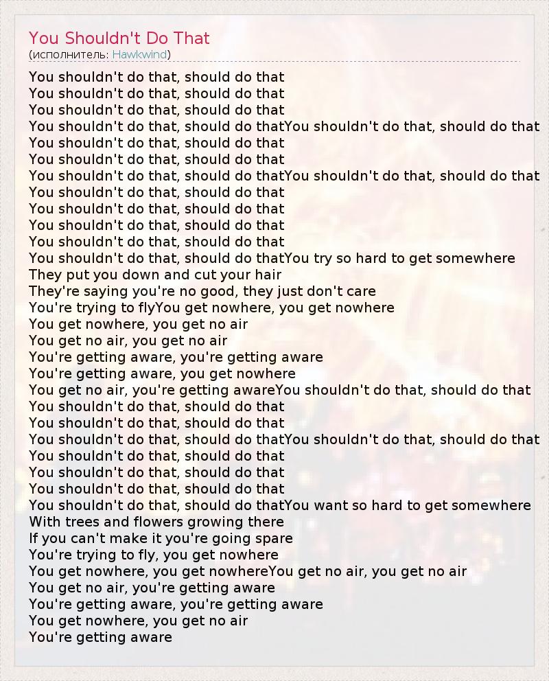 You shouldn't do that, should do that You shouldn't do that, should do that You shouldn't do that, should do that You shouldn't do that, should do thatYou shouldn't do that, should do that You shouldn't do that, should do that You shouldn't do that, should do that You shouldn't do that, should do thatYou shouldn't do that, should do that You shouldn't do that, should do that You shouldn't do that, should do that You shouldn't do that, should do that You shouldn't do that, should do that You shouldn't do that, should do thatYou try so hard to get somewhere They put you down and cut your hair They're saying you're no good, they just don't care You're trying to flyYou get nowhere, you get nowhere You get nowhere, you get no air You get no air, you get no air You're getting aware, you're getting aware You're getting aware, you get nowhere You get no air, you're getting awareYou shouldn't do that, should do that You shouldn't do that, should do that You shouldn't do that, should do that You shouldn't do that, should do thatYou shouldn't do that, should do that You shouldn't do that, should do that You shouldn't do that, should do that You shouldn't do that, should do that You shouldn't do that, should do thatYou want so hard to get somewhere With trees and flowers growing there If you can't make it you're going spare You're trying to fly, you get nowhere You get nowhere, you get nowhereYou get no air, you get no air You get no air, you're getting aware You're getting aware, you're getting aware You get nowhere, you get no air You're getting aware