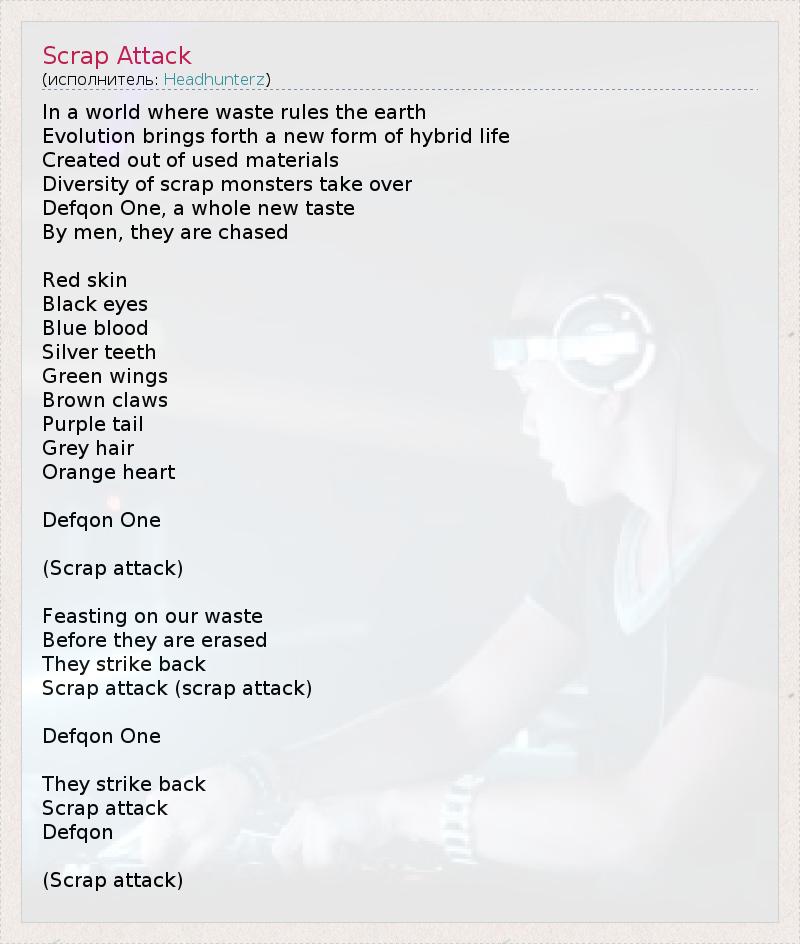 In a world where waste rules the earth Evolution brings forth a new form of hybrid life Created out of used materials Diversity of scrap monsters take over Defqon One, a whole new taste By men, they are chased Red skin Black eyes Blue blood Silver teeth Green wings Brown claws Purple tail Grey hair Orange heart Defqon One (Scrap attack) Feasting on our waste Before they are erased They strike back Scrap attack (scrap attack) Defqon One They strike back Scrap attack Defqon (Scrap attack)