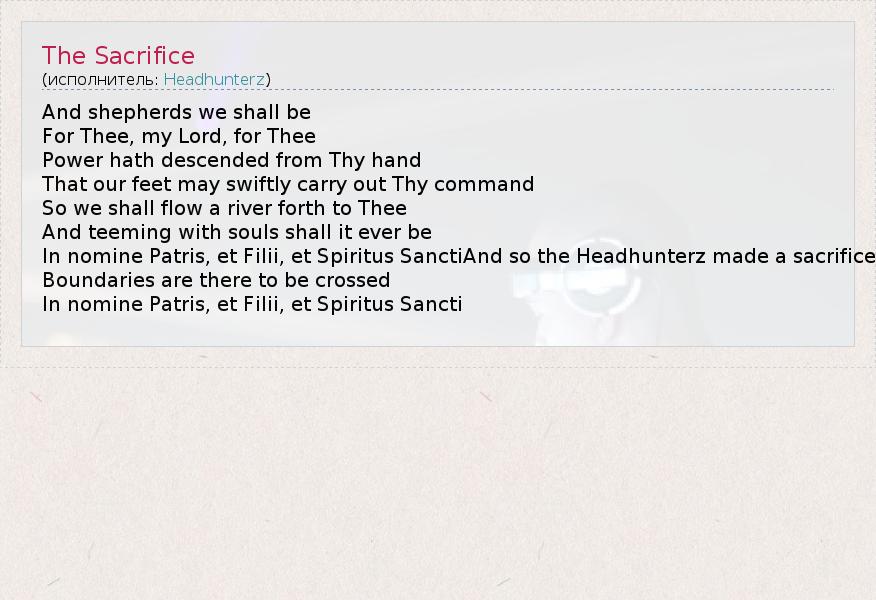 And shepherds we shall be For Thee, my Lord, for Thee Power hath descended from Thy hand That our feet may swiftly carry out Thy command So we shall flow a river forth to Thee And teeming with souls shall it ever be In nomine Patris, et Filii, et Spiritus SanctiAnd so the Headhunterz made a sacrifice Boundaries are there to be crossed In nomine Patris, et Filii, et Spiritus Sancti