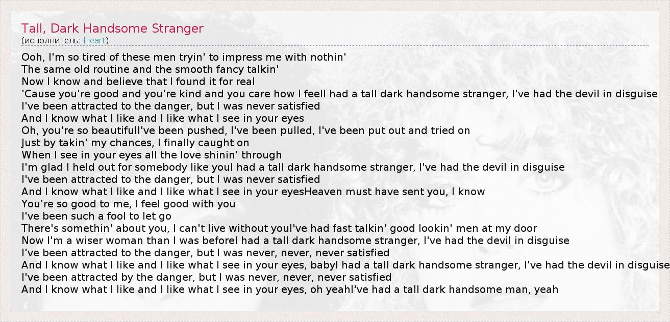 А как ты думаешь, о чем песня "Tall, Dark Handsome Stranger" ?