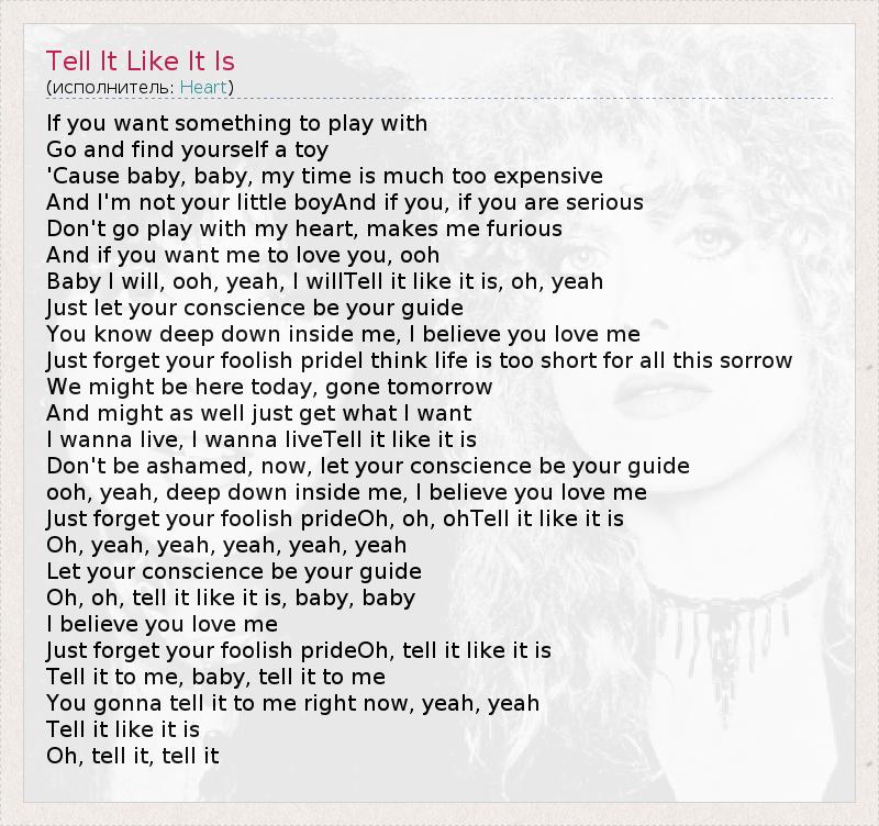 If you want something to play with Go and find yourself a toy 'Cause baby, baby, my time is much too expensive And I'm not your little boyAnd if you, if you are serious Don't go play with my heart, makes me furious And if you want me to love you, ooh Baby I will, ooh, yeah, I willTell it like it is, oh, yeah Just let your conscience be your guide You know deep down inside me, I believe you love me Just forget your foolish prideI think life is too short for all this sorrow We might be here today, gone tomorrow And might as well just get what I want I wanna live, I wanna liveTell it like it is Don't be ashamed, now, let your conscience be your guide ooh, yeah, deep down inside me, I believe you love me Just forget your foolish prideOh, oh, ohTell it like it is Oh, yeah, yeah, yeah, yeah, yeah Let your conscience be your guide Oh, oh, tell it like it is, baby, baby I believe you love me Just forget your foolish prideOh, tell it like it is Tell it to me, baby, tell it to me You gonna tell it to me right now, yeah, yeah Tell it like it is Oh, tell it, tell it