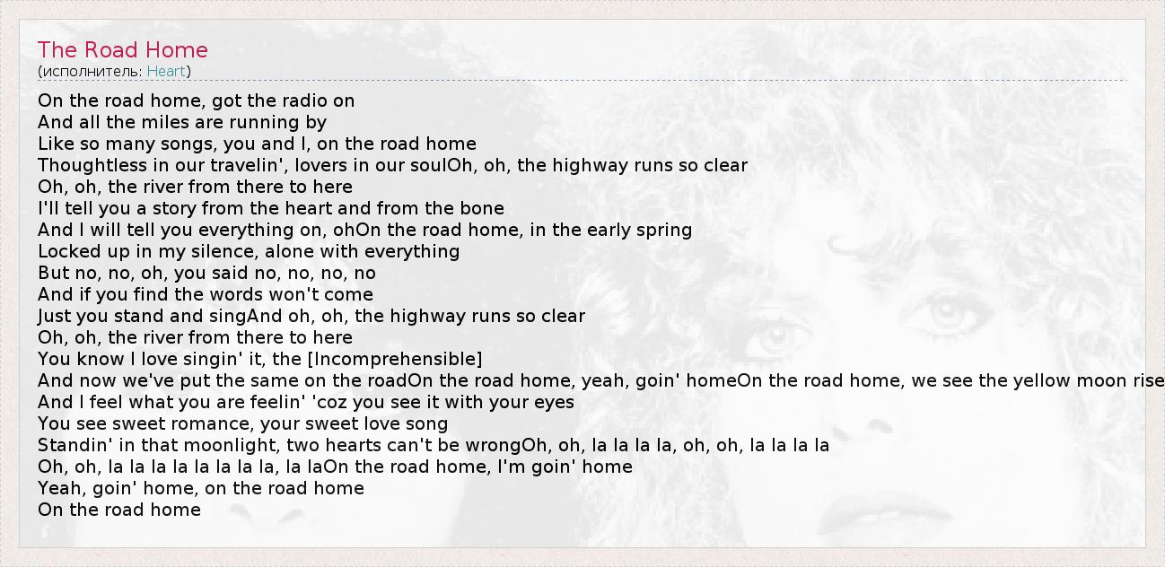 On the road home, got the radio on And all the miles are running by Like so many songs, you and I, on the road home Thoughtless in our travelin', lovers in our soulOh, oh, the highway runs so clear Oh, oh, the river from there to here I'll tell you a story from the heart and from the bone And I will tell you everything on, ohOn the road home, in the early spring Locked up in my silence, alone with everything But no, no, oh, you said no, no, no, no And if you find the words won't come Just you stand and singAnd oh, oh, the highway runs so clear Oh, oh, the river from there to here You know I love singin' it, the [Incomprehensible] And now we've put the same on the roadOn the road home, yeah, goin' homeOn the road home, we see the yellow moon rise And I feel what you are feelin' 'coz you see it with your eyes You see sweet romance, your sweet love song Standin' in that moonlight, two hearts can't be wrongOh, oh, la la la la, oh, oh, la la la la Oh, oh, la la la la la la la la, la laOn the road home, I'm goin' home Yeah, goin' home, on the road home On the road home