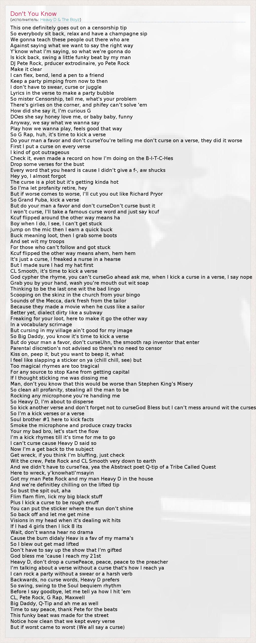 This one definitely goes out on a censorship tip So everybody sit back, relax and have a champagne sip We gonna teach these people out there who are Against saying what we want to say the right way Y'know what I'm saying, so what we're gonna do Is kick back, swing a little funky beat by my man DJ Pete Rock, prducer extrodinaire, yo Pete Rock Make it clear I can flex, bend, lend a pen to a friend Keep a party pimping from now to then I don't have to swear, curse or juggle Lyrics in the verse to make a party bubble So mister Censorship, tell me, what's your problem There's girlies on the corner, and phifey can't solve 'em How did she say it, I'm curious G DOes she say honey love me, or baby baby, funny Anyway, we say what we wanna say Play how we wanna play, feels good that way So G Rap, huh, it's time to kick a verse Do your man a favor and don't curseYou're telling me don't curse on a verse, they did it worse First I put a curse on every verse I kind of got outrageous Check it, even made a record on how I'm doing on the B-I-T-C-Hes Drop some verses for the bust Every word that you heard is cause I didn't give a f-, aw shucks Hey yo, I almost forgot The curse is a plot but it's getting kinda hot So I'ma let profanity retire, hey But if worse comes to worse, I'll cut you out like Richard Pryor So Grand Puba, kick a verse But do your man a favor and don't curseDon't curse bust it I won't curse, I'll take a famous curse word and just say kcuf Kcuf flipped around the other way means ha Boy when I do, I see, I can't get stuck Jump on the mic then I earn a quick buck Buck meaning loot, then I grab some boots And set wit my troops For those who can't follow and got stuck Kcuf flipped the other way means ahem, hem hem It's just a curse, I freaked a nurse in a hearse But I made sure I had my hat first CL Smooth, it's time to kick a verse God cypher the rhyme, you can't curseGo ahead ask me, when I kick a curse in a verse, I say nope Grab you by your hand, wash you're mouth out wit soap Thinking to be the last one wit the bad lingo Scooping on the skinz in the church from your bingo Sounds of the Mecca, dark fresh from the tailor Because they made a movie when he cuss like a sailor Better yet, dialect dirty like a subway Freaking for your loot, here to make it go the other way In a vocabulary scrimage But cursing in my village ain't good for my image So Big Daddy, you know it's time to kick a verse But do your man a favor, don't curseUhn, the smooth rap inventor that enter Parental discretion's not advised so there's no need to censor Kiss on, peep it, but you want to beep it, what I feel like slapping a sticker on ya (chill chill, see) but Too magical rhymes are too tragical For any source to stop Kane from getting capital If I thought sticking me was dissing me Man, don't you know that this would be worse than Stephen King's Misery So clean all profanity, stealing all the man to be Rocking any microphone you're handing me So Heavy D, I'm about to disperse So kick another verse and don't forget not to curseGod Bless but I can't mess around wit the curses So I'm a kick verses or a verse Soul brother #1 here to kick facts Smoke the microphone and produce crazy tracks Your my bad bro, let's start the flow I'm a kick rhymes till it's time for me to go I can't curse cause Heavy D said so Now I'm a get back to the subject Get wreck, if you think I'm bluffing, just check Wit the crew, Pete Rock and CL Smooth very down to earth And we didn't have to curseYea, yea the Abstract poet Q-tip of a Tribe Called Quest Here to wreck, y'knowhatI'msayin Got my man Pete Rock and my man Heavy D in the house And we're definitley chilling on the lifted tip So bust the spit out, aha Flim flam flim, lick my big black stuff Plus I kick a curse to be rough enuff You can put the sticker where the sun don't shine So back off and let me get mine Visions in my head when it's dealing wit hits If I had 4 girls then I lick 8 its Wait, don't wanna hear no drama Cause the bum didaly Heav is a fav of my mama's So I blew out get mad lifted Don't have to say up the show that I'm gifted God bless me 'cause I reach my 21st Heavy D, don't drop a cursePeace, peace, peace to the preacher I'm talking about a verse without a curse that's how I reach ya I can rock a party without a swear or a harsh verb Backwards, no curse words, Heavy D prefers So swing, swing to the Soul bequiem rhythm Before I say goodbye, let me tell ya how I hit 'em CL, Pete Rock, G Rap, Maxwell Big Daddy, Q-Tip and ah me as well Time to say peace, thank Pete for the beats This funky beat was made for the street Notice how clean that we kept every verse But if worst came to worst (We all say a curse)