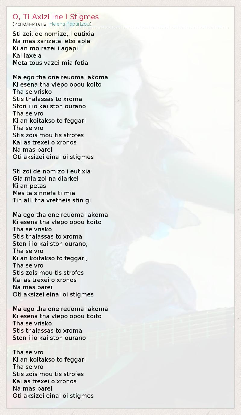 А как ты думаешь, о чем песня "O, Ti Axizi Ine I Stigmes" ?