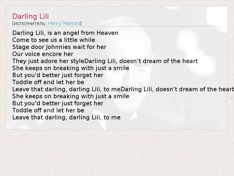 А как ты думаешь, о чем песня "Darling Lili" ?
