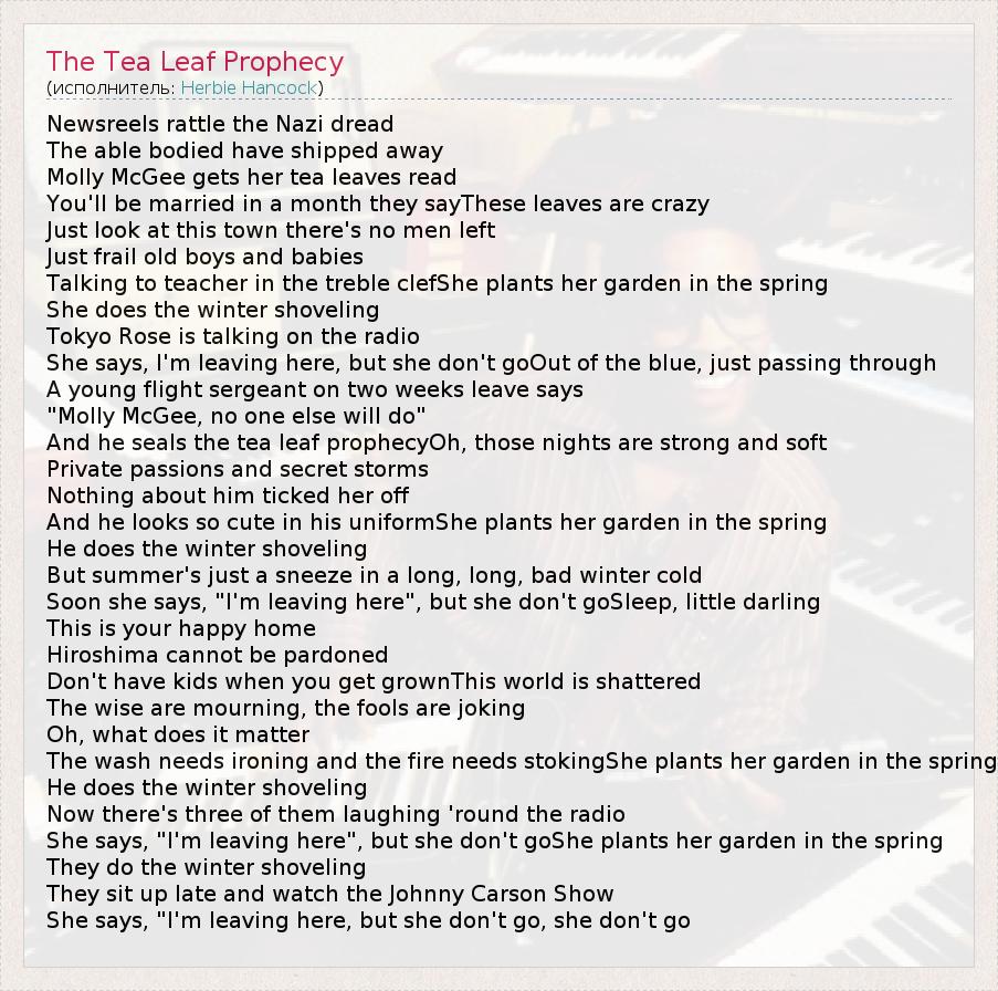 А как ты думаешь, о чем песня "The Tea Leaf Prophecy" ?