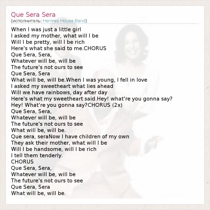 When I was just a little girl I asked my mother, what will I be Will I be pretty, will I be rich Here's what she said to me.CHORUS Que Sera, Sera, Whatever will be, will be The future's not ours to see Que Sera, Sera What will be, will be.When I was young, I fell in love I asked my sweetheart what lies ahead Will we have rainbows, day after day Here's what my sweetheart said.Hey! what're you gonna say? Hey! What're you gonna say?CHORUS (2x) Que Sera, Sera, Whatever will be, will be The future's not ours to see What will be, will be. Que sera, seraNow I have children of my own They ask their mother, what will I be Will I be handsome, will I be rich I tell them tenderly. CHORUS Que Sera, Sera, Whatever will be, will be The future's not ours to see Que Sera, Sera What will be, will be.