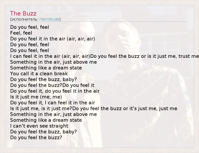 Do you feel, feel Feel, feel Do you feel it in the air (air, air, air) Do you feel, feel Do you feel, feel I can feel it in the air (air, air, air)Do you feel the buzz or is it just me, trust me Something in the air, just above me Something like a dream state You call it a clean break Do you feel the buzz, baby? Do you feel the buzz?Do you feel it Do you feel it, do you feel it in the air Is it just me (me, me) Do you feel it, I can feel it in the air Is it just me, is it just me?Do you feel the buzz or it's just me, just me Something in the air, just above me Something like a dream state I can't even see straight Do you feel the buzz, baby? Do you feel the buzz?