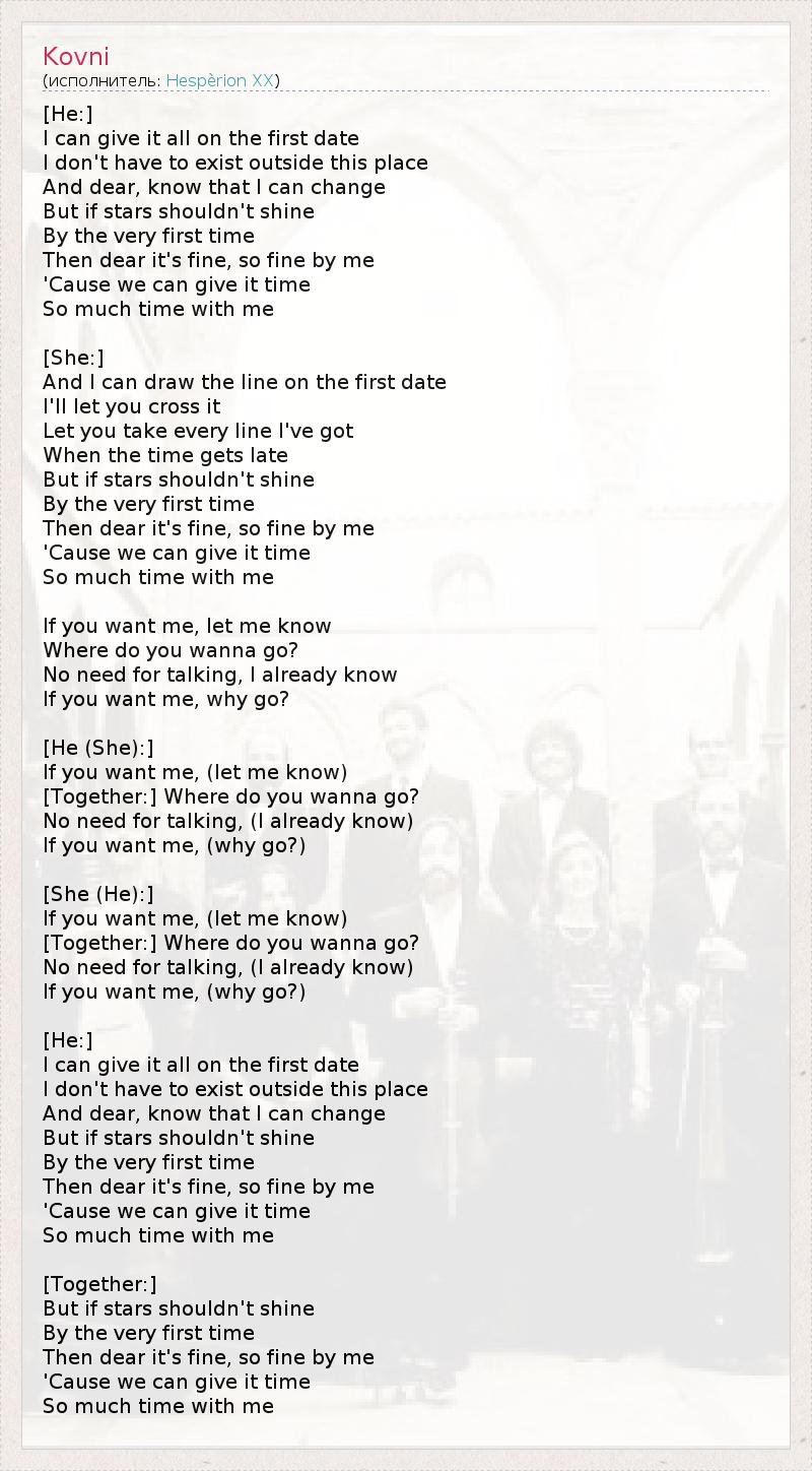 [Он:] Я могу отдать всё на первом свидании, Мне не нужно существовать где-то ещё, И, дорогая, знай – я могу измениться. Но если звёзды не сойдутся 1 В самый первый раз, То, милая, всё хорошо, я не буду против, Ведь мы можем не торопиться, Впереди так много времени со мной. [Она:] А я могу очертить на первом свидании границу И позволю тебе пересечь её, Позволю взять любые мои барьеры В поздний час. Но если звёзды не сойдутся В самый первый раз, То, милый, всё хорошо, я не буду против, Ведь мы можем не торопиться, Впереди так много времени со мной. Если я нужна тебе, скажи, Куда ты хочешь уйти? Слова ни к чему, я уже знаю. Но если я нужна тебе, зачем уходить?.. [Он (Она):] Если я нужен тебе, скажи, [Вместе:] Куда ты хочешь уйти? Слова ни к чему, я уже знаю, Но если я нужен тебе, зачем уходить?.. [Она (Он):] Если я нужна тебе, скажи, [Вместе:] Куда ты хочешь уйти? Слова ни к чему, я уже знаю, Но если я нужна тебе, зачем уходить?.. [Он:] Я могу отдать всё на первом свидании, Мне не нужно существовать где-то ещё, И, дорогой, знай – я могу измениться. Но если звёзды не сойдутся В самый первый раз, То, милый, всё хорошо, я не буду против, Ведь мы можем не торопиться, Впереди так много времени со мной. [Вместе:] Но если звёзды не сойдутся В самый первый раз, То, милая, всё хорошо, я не буду против, Ведь мы можем не торопиться, Впереди так много времени со мной. 1 - дословно: не засветят