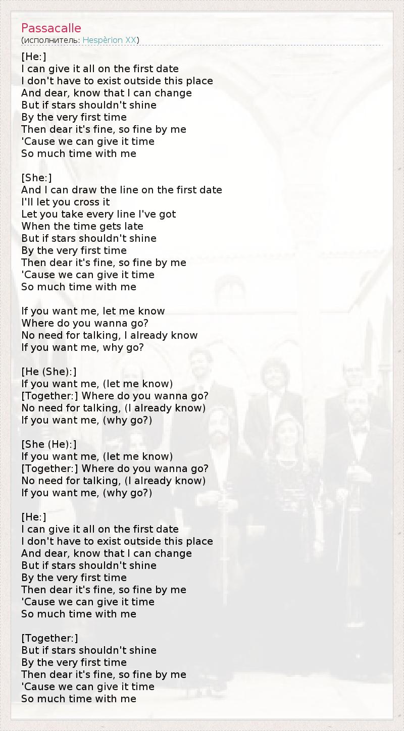 [He:] I can give it all on the first date I don't have to exist outside this place And dear, know that I can change But if stars shouldn't shine By the very first time Then dear it's fine, so fine by me 'Cause we can give it time So much time with me [She:] And I can draw the line on the first date I'll let you cross it Let you take every line I've got When the time gets late But if stars shouldn't shine By the very first time Then dear it's fine, so fine by me 'Cause we can give it time So much time with me If you want me, let me know Where do you wanna go? No need for talking, I already know If you want me, why go? [He (She):] If you want me, (let me know) [Together:] Where do you wanna go? No need for talking, (I already know) If you want me, (why go?) [She (He):] If you want me, (let me know) [Together:] Where do you wanna go? No need for talking, (I already know) If you want me, (why go?) [He:] I can give it all on the first date I don't have to exist outside this place And dear, know that I can change But if stars shouldn't shine By the very first time Then dear it's fine, so fine by me 'Cause we can give it time So much time with me [Together:] But if stars shouldn't shine By the very first time Then dear it's fine, so fine by me 'Cause we can give it time So much time with me