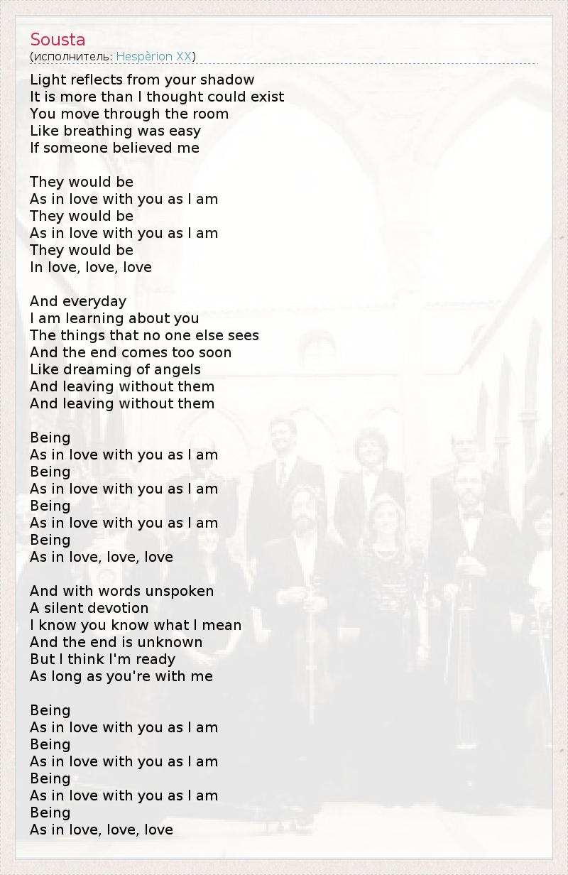 Light reflects from your shadow It is more than I thought could exist You move through the room Like breathing was easy If someone believed me They would be As in love with you as I am They would be As in love with you as I am They would be In love, love, love And everyday I am learning about you The things that no one else sees And the end comes too soon Like dreaming of angels And leaving without them And leaving without them Being As in love with you as I am Being As in love with you as I am Being As in love with you as I am Being As in love, love, love And with words unspoken A silent devotion I know you know what I mean And the end is unknown But I think I'm ready As long as you're with me Being As in love with you as I am Being As in love with you as I am Being As in love with you as I am Being As in love, love, love