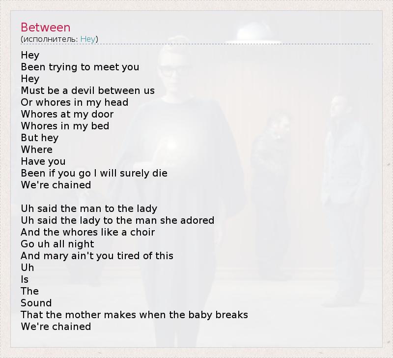 Hey Been trying to meet you Hey Must be a devil between us Or whores in my head Whores at my door Whores in my bed But hey Where Have you Been if you go I will surely die We're chained Uh said the man to the lady Uh said the lady to the man she adored And the whores like a choir Go uh all night And mary ain't you tired of this Uh Is The Sound That the mother makes when the baby breaks We're chained