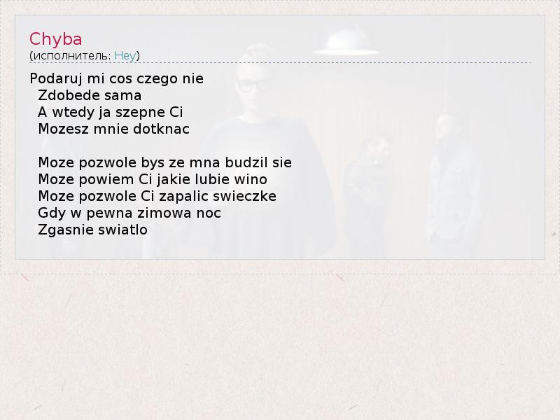 Это интересно:"Hey" - польская рок-группа, основанная в городе Шецине в 1992 году гитаристом Петром Банахом и харизматичной воклисткой Касей Носовской. Группа с начала 90ых годов является одной из самых популярных в Польше.Несмотря на то, что "Hey" описывают свой стиль как первая польская группа, играющая в стиле гранж, их мелодичный, гитарный рок и эклектичное выступление попадает под влияние... продолжение