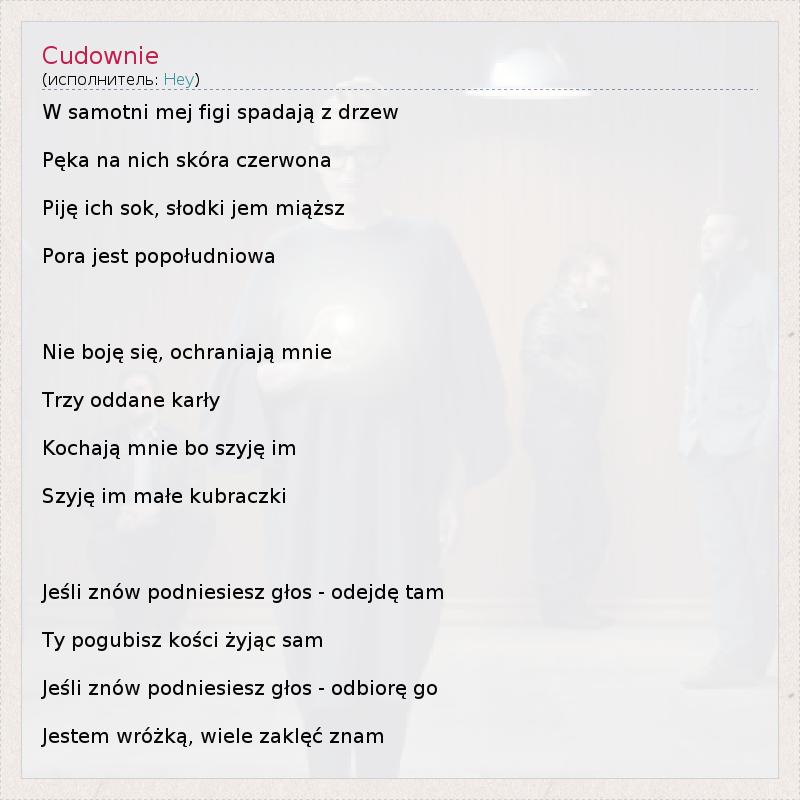 Это интересно:"Hey" - польская рок-группа, основанная в городе Шецине в 1992 году гитаристом Петром Банахом и харизматичной воклисткой Касей Носовской. Группа с начала 90ых годов является одной из самых популярных в Польше.Несмотря на то, что "Hey" описывают свой стиль как первая польская группа, играющая в стиле гранж, их мелодичный, гитарный рок и эклектичное выступление попадает под влияние... продолжение