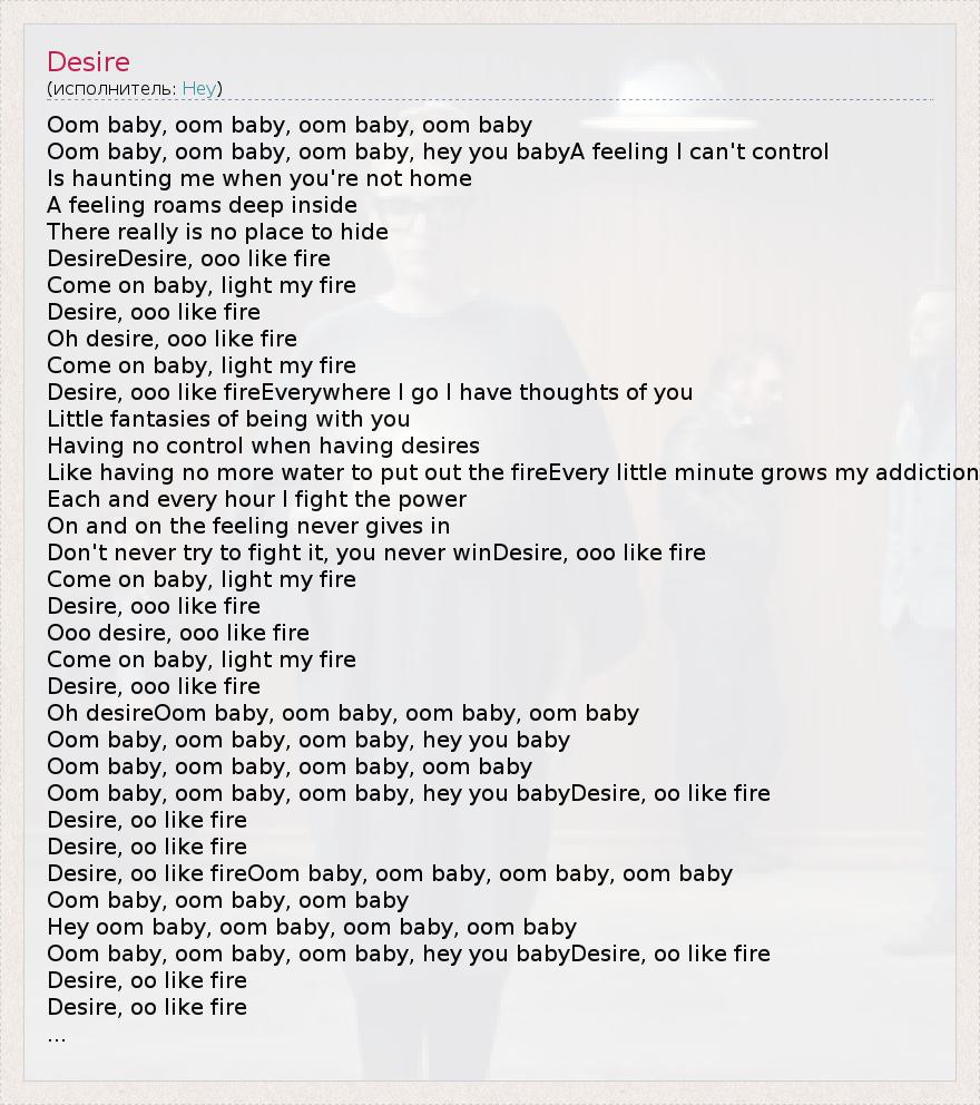 Oom baby, oom baby, oom baby, oom baby Oom baby, oom baby, oom baby, hey you babyA feeling I can't control Is haunting me when you're not home A feeling roams deep inside There really is no place to hide DesireDesire, ooo like fire Come on baby, light my fire Desire, ooo like fire Oh desire, ooo like fire Come on baby, light my fire Desire, ooo like fireEverywhere I go I have thoughts of you Little fantasies of being with you Having no control when having desires Like having no more water to put out the fireEvery little minute grows my addiction Each and every hour I fight the power On and on the feeling never gives in Don't never try to fight it, you never winDesire, ooo like fire Come on baby, light my fire Desire, ooo like fire Ooo desire, ooo like fire Come on baby, light my fire Desire, ooo like fire Oh desireOom baby, oom baby, oom baby, oom baby Oom baby, oom baby, oom baby, hey you baby Oom baby, oom baby, oom baby, oom baby Oom baby, oom baby, oom baby, hey you babyDesire, oo like fire Desire, oo like fire Desire, oo like fire Desire, oo like fireOom baby, oom baby, oom baby, oom baby Oom baby, oom baby, oom baby Hey oom baby, oom baby, oom baby, oom baby Oom baby, oom baby, oom baby, hey you babyDesire, oo like fire Desire, oo like fire Desire, oo like fire ...