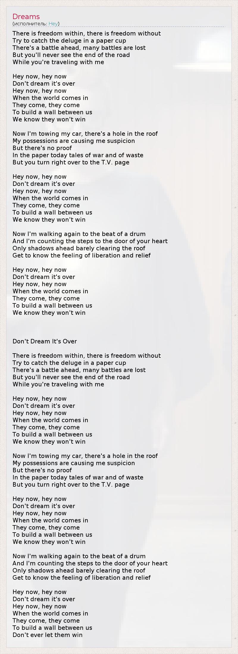 There is freedom within, there is freedom without Try to catch the deluge in a paper cup There's a battle ahead, many battles are lost But you'll never see the end of the road While you're traveling with me Hey now, hey now Don't dream it's over Hey now, hey now When the world comes in They come, they come To build a wall between us We know they won't win Now I'm towing my car, there's a hole in the roof My possessions are causing me suspicion But there's no proof In the paper today tales of war and of waste But you turn right over to the T.V. page Hey now, hey now Don't dream it's over Hey now, hey now When the world comes in They come, they come To build a wall between us We know they won't win Now I'm walking again to the beat of a drum And I'm counting the steps to the door of your heart Only shadows ahead barely clearing the roof Get to know the feeling of liberation and relief Hey now, hey now Don't dream it's over Hey now, hey now When the world comes in They come, they come To build a wall between us We know they won't win Don't Dream It's Over There is freedom within, there is freedom without Try to catch the deluge in a paper cup There's a battle ahead, many battles are lost But you'll never see the end of the road While you're traveling with me Hey now, hey now Don't dream it's over Hey now, hey now When the world comes in They come, they come To build a wall between us We know they won't win Now I'm towing my car, there's a hole in the roof My possessions are causing me suspicion But there's no proof In the paper today tales of war and of waste But you turn right over to the T.V. page Hey now, hey now Don't dream it's over Hey now, hey now When the world comes in They come, they come To build a wall between us We know they won't win Now I'm walking again to the beat of a drum And I'm counting the steps to the door of your heart Only shadows ahead barely clearing the roof Get to know the feeling of liberation and relief Hey now, hey now Don't dream it's over Hey now, hey now When the world comes in They come, they come To build a wall between us Don't ever let them win