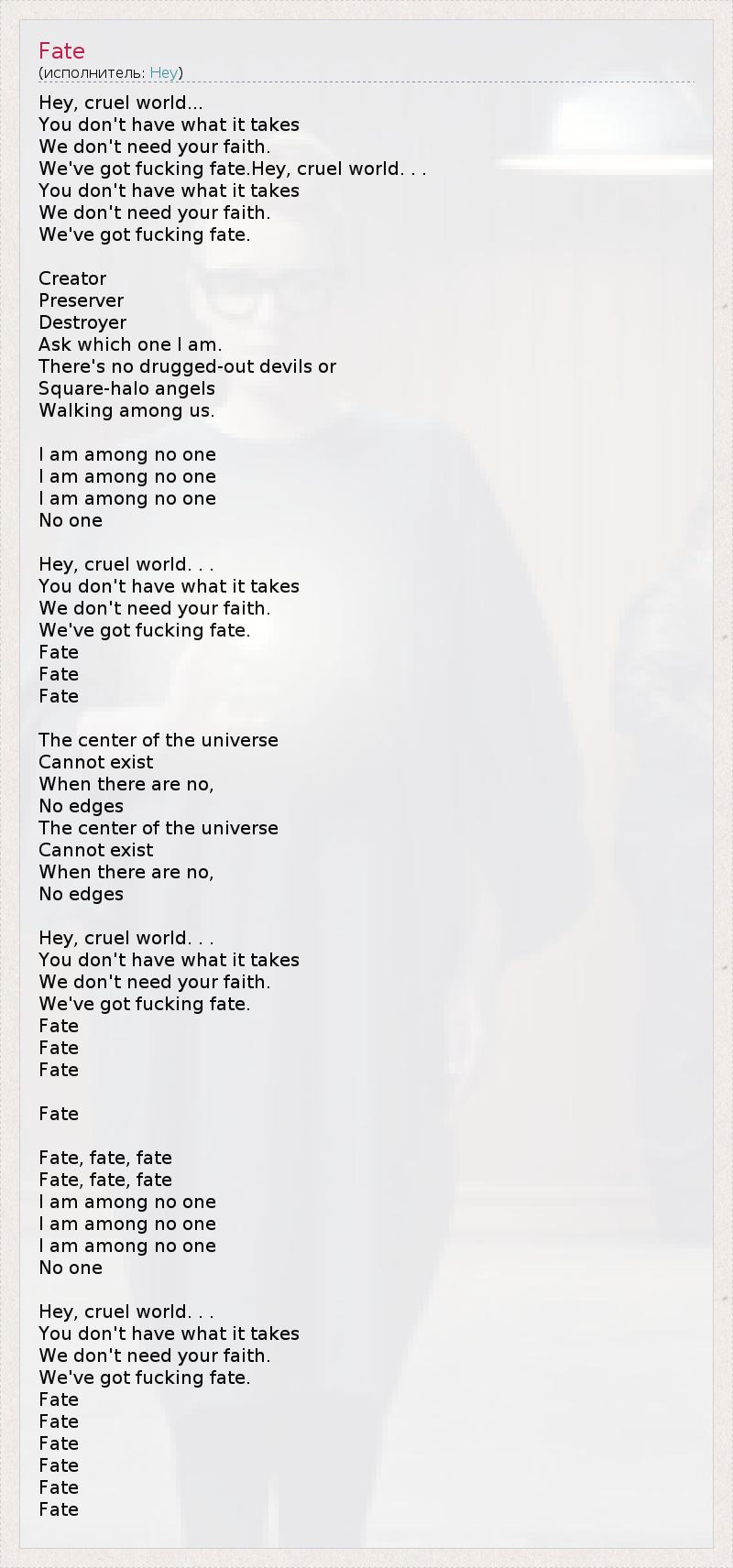 Эй, жестокий мир... У тебя нет того, что нужно. Нам не нужна твоя вера. У нас есть своя е**ная судьба. Эй, жестокий мир... У тебя нет того, что нужно. Нам не нужна твоя вера. У нас есть своя е**ная судьба. Создатель. Хранитель. Разрушитель. Спроси, кто из них я. Здесь нет дьяволов, напичканных наркотиками, Или ангелов с квадратными нимбами, Шагающих среди нас. Я сам по себе, Я сам по себе, Я сам по себе, Сам. Эй, жестокий мир... У тебя нет того, что ему нужно. Нам не нужна твоя вера. У нас есть своя е**ная судьба. Судьба Судьба Судьба Центр Вселенной Не может существовать, Если нет Краёв. Центр Вселенной Не может существовать, Если нет Краёв. Эй, жестокий мир... У тебя нет того, что нужно. Нам не нужна твоя вера. У нас есть своя е**ная судьба. Судьба Судьба Судьба Судьба Судьба, судьба, судьба Судьба, судьба, судьба Я сам по себе Я сам по себе Я сам по себе Сам Эй, жестокий мир... У тебя нет того, что нужно. Нам не нужна твоя вера. У нас есть своя е**ная судьба. Судьба Судьба Судьба Судьба Судьба Судьба