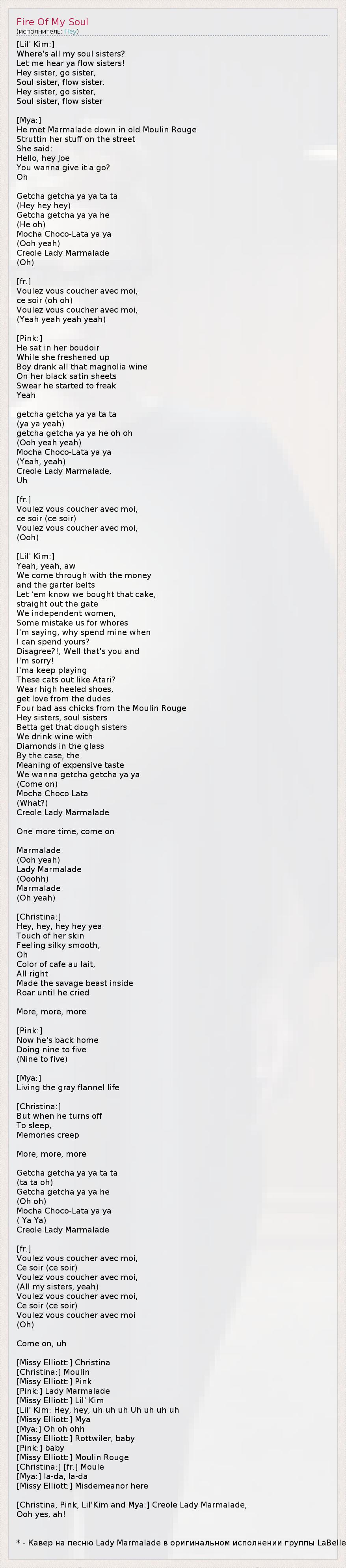 1 – Словосочетание «soul sister» используется темнокожими жителями Америки и переводится как «сестра по цвету кожи, чёрная сестра», но поскольку Christina и Pink не афроамериканки, можно допустить перевод «сестра по духу».