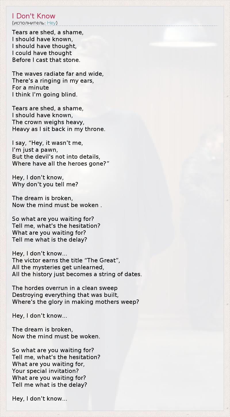 Слёзы пролились, вот жалость, Мне стоило узнать, Мне стоило подумать, Я мог бы подумать, Прежде чем бросать камень. Волны разбегаются далеко, В моих ушах звон, На минуту Я подумал, что слепну. Слёзы пролились, вот жалость. Мне стоило знать, Тяжела корона для меня, Когда я сижу на своём троне. Я сказал: "Эй, это был не я, Я всего лишь пешка, Но дьявол не вдаётся в детали, Куда же подевались все герои?" Эй, я не знаю, Почему бы тебе не сказать мне? Мечта разрушена, Теперь разум нужно пробудить. Так чего ты ждёшь? Скажи, с чего эта нерешительность? Так чего ты ждёшь? Скажи, что за задержка? Эй, я не знаю... Победитель получит титул "Великий", Все загадки останутся неусвоенными, Вся история станет лишь списком дат. Орды сметают всё начисто, Уничтожая созданное. Вы заставляете матерей рыдать — в чём тут слава? Эй, я не знаю... Мечта разрушена, Теперь разум нужно пробудить. Так чего ты ждёшь? Скажи, с чего эта нерешительность? Так чего ты ждёшь? Специального приглашения? Так чего ты ждёшь? Скажи, что за задержка? Эй, я не знаю...