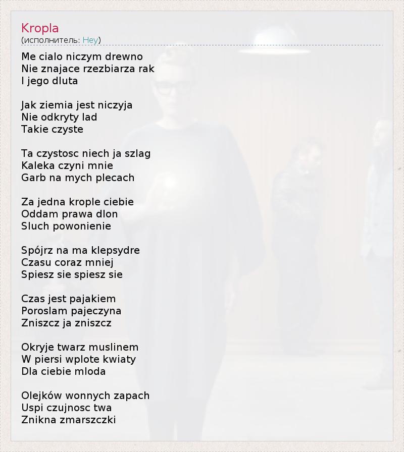 Это интересно:"Hey" - польская рок-группа, основанная в городе Шецине в 1992 году гитаристом Петром Банахом и харизматичной воклисткой Касей Носовской. Группа с начала 90ых годов является одной из самых популярных в Польше.Несмотря на то, что "Hey" описывают свой стиль как первая польская группа, играющая в стиле гранж, их мелодичный, гитарный рок и эклектичное выступление попадает под влияние... продолжение