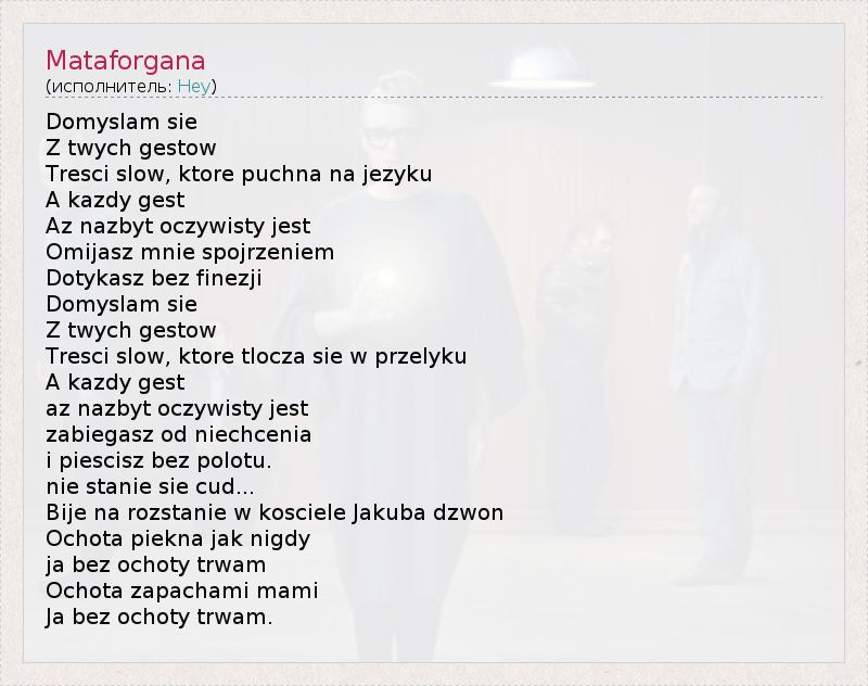 Это интересно:"Hey" - польская рок-группа, основанная в городе Шецине в 1992 году гитаристом Петром Банахом и харизматичной воклисткой Касей Носовской. Группа с начала 90ых годов является одной из самых популярных в Польше.Несмотря на то, что "Hey" описывают свой стиль как первая польская группа, играющая в стиле гранж, их мелодичный, гитарный рок и эклектичное выступление попадает под влияние... продолжение