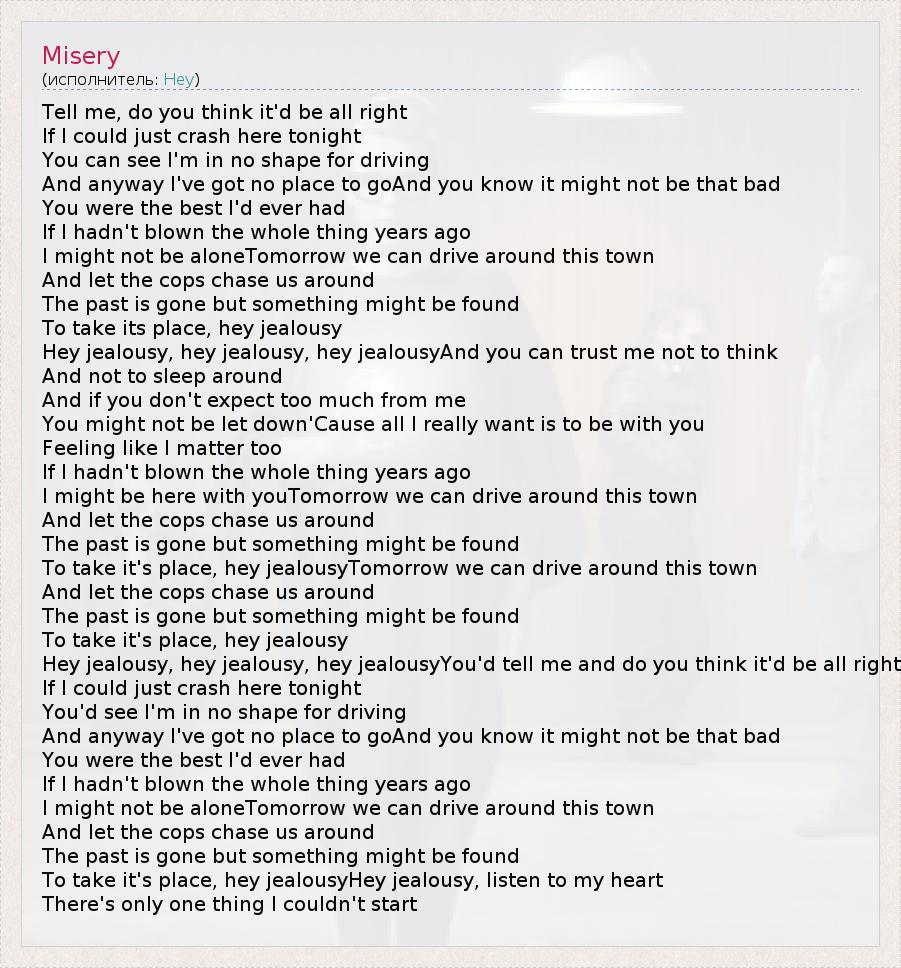 Tell me, do you think it'd be all right If I could just crash here tonight You can see I'm in no shape for driving And anyway I've got no place to goAnd you know it might not be that bad You were the best I'd ever had If I hadn't blown the whole thing years ago I might not be aloneTomorrow we can drive around this town And let the cops chase us around The past is gone but something might be found To take its place, hey jealousy Hey jealousy, hey jealousy, hey jealousyAnd you can trust me not to think And not to sleep around And if you don't expect too much from me You might not be let down'Cause all I really want is to be with you Feeling like I matter too If I hadn't blown the whole thing years ago I might be here with youTomorrow we can drive around this town And let the cops chase us around The past is gone but something might be found To take it's place, hey jealousyTomorrow we can drive around this town And let the cops chase us around The past is gone but something might be found To take it's place, hey jealousy Hey jealousy, hey jealousy, hey jealousyYou'd tell me and do you think it'd be all right If I could just crash here tonight You'd see I'm in no shape for driving And anyway I've got no place to goAnd you know it might not be that bad You were the best I'd ever had If I hadn't blown the whole thing years ago I might not be aloneTomorrow we can drive around this town And let the cops chase us around The past is gone but something might be found To take it's place, hey jealousyHey jealousy, listen to my heart There's only one thing I couldn't start