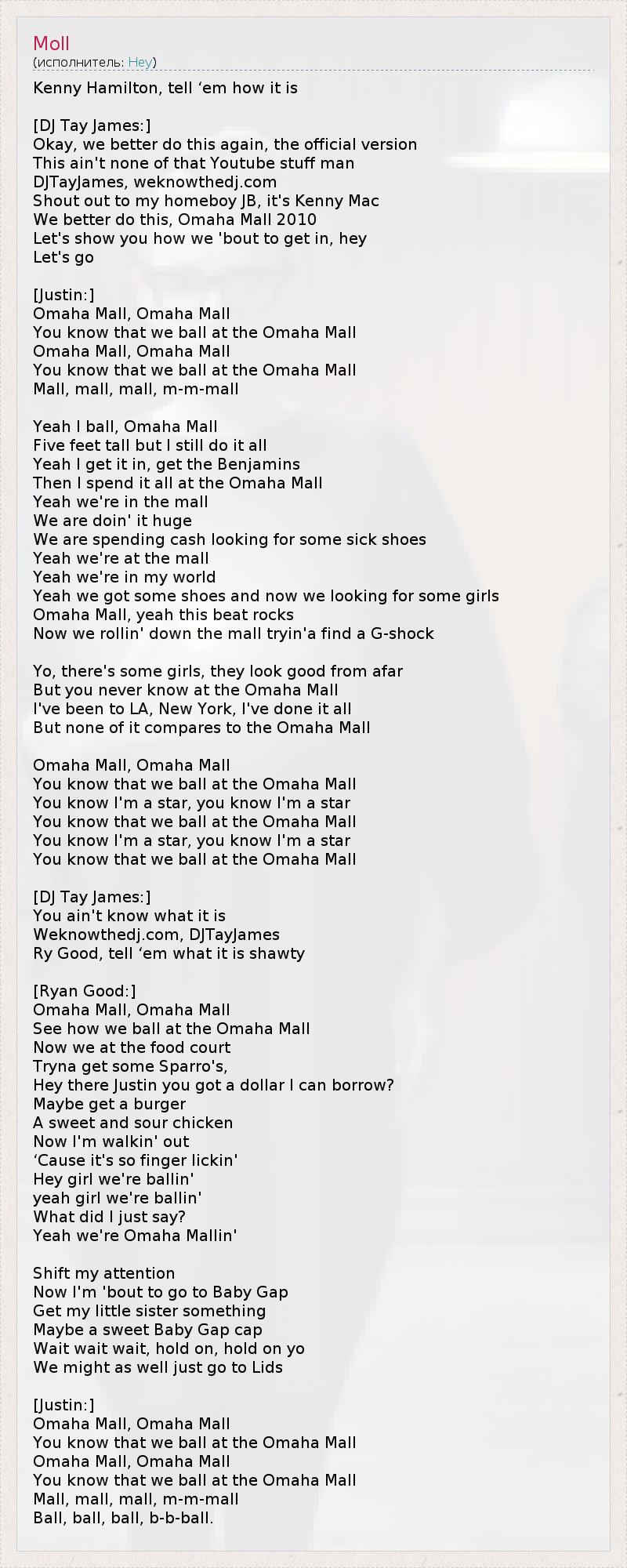 Кенни Хамилтон, 1 давай, скажи им! [DJ Tay James:] Хорошо, сделаем это еще раз, так сказать, официальная версия. Это тебе не видео на YouTube, чувак, Это DJ TayJames, weknowthedj.com, Поприветствуйте моего кореша JB, а это Кенни Мак! Мы сделаем это, Омаха Молл 2010. Покажем всем, что мы уже готовы развлекаться, эй! Поехали! [Justin:] Омаха Молл, Омаха Молл! Вы знаете, что мы шикарно погуляем в Омаха Молл. Омаха Молл, Омаха Молл! Вы знаете, что мы шикарно погуляем в Омаха Молл. Молл, Молл, Молл, м-м-молл. Да, я проматываю деньги, Омаха Молл, Во мне пять футов роста, но я все равно это делаю. Да, я зарабатываю много Бенджаминов, А потом трачу их все в Омаха Молл. Да, мы в торговом центре, Мы закупаемся по-крупному, Тратим наличные, хотим найти крутую обувь. Да, мы в торговом центре, Да, это мой мир. Так, ботинки мы нашли, теперь мы хотим познакомиться с девчонками. Омаха Молл, да, этот бит качает! Теперь мы бродим по этажам в поисках G-Shock. 2 Вот идут девчонки, издали кажется, что они симпатичные, Но в Омаха Молл ты никогда не поймешь толком. Я был в Лос-Анджелесе, в Нью-Йорке, я много повидал, Но ничто не сравнится с Омаха Молл. Омаха Молл, Омаха Молл! Вы знаете, что мы шикарно погуляем в Омаха Молл. Вы знаете, что я звезда, знаете, что я звезда. Вы знаете, что мы шикарно погуляем в Омаха Молл. Вы знаете, что я звезда, знаете, что я звезда. Вы знаете, что мы шикарно погуляем в Омаха Молл. [DJ Tay James:] Вы даже не представляете, что это - Weknowthedj.com, DJ TayJames, Рай Гуд, давай, расскажи им, что на самом деле круто. [Ryan Good:] Омаха Молл, Омаха Молл! Смотрите, как мы шикарно тусуем в Омаха Молл. Сейчас мы в ресторанном дворике, Хотим взять себе что-нибудь в Сбарро. Эй, Джастин, не одолжишь мне доллар? Может, мне взять себе гамбургер И курицу с кисло-сладким соусом? А потом я лучше пойду, А то здесь от всего слюнки текут. Эй, девчонка, мы шикарно гуляем, Да, мы шикарно гуляем... Что я только что сказал? А, да, мы омахо-моллим. Переключусь на другое, Зайду в Baby Gap, 3 Куплю что-нибудь своей маленькой сестренке, Может быть, милую шапочку... Подождите, подождите, подождите, стойте, стойте, Может, тогда зайдем еще в Lids? [Justin:] Омаха Молл, Омаха Молл! Вы знаете, что мы шикарно погуляем в Омаха Молл. Омаха Молл, Омаха Молл! Вы знаете, что мы шикарно погуляем в Омаха Молл. Молл, Молл, Молл, М-м-молл. Шикарно, шикарно, ш-ш-шикарно. 1 - охранник Джастина Бибера 2 - часы Casio 3 - бренд детской одежды и, соответственно, название магазина