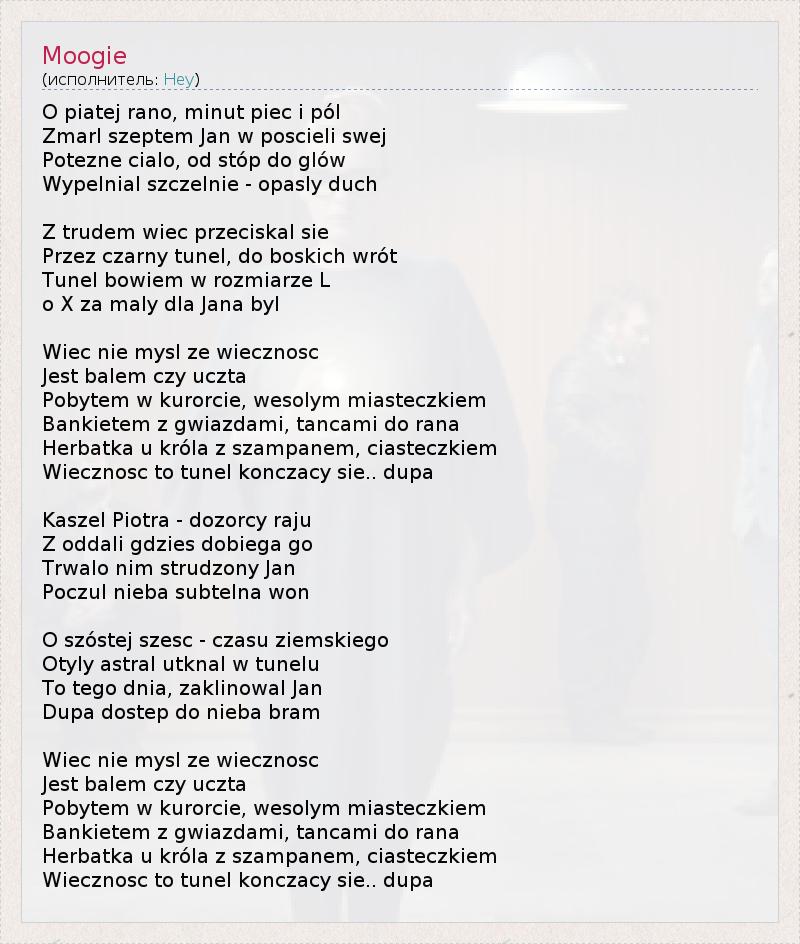 O piatej rano, minut piec i pól Zmarl szeptem Jan w poscieli swej Potezne cialo, od stóp do glów Wypelnial szczelnie - opasly duch Z trudem wiec przeciskal sie Przez czarny tunel, do boskich wrót Tunel bowiem w rozmiarze L o X za maly dla Jana byl Wiec nie mysl ze wiecznosc Jest balem czy uczta Pobytem w kurorcie, wesolym miasteczkiem Bankietem z gwiazdami, tancami do rana Herbatka u króla z szampanem, ciasteczkiem Wiecznosc to tunel konczacy sie.. dupa Kaszel Piotra - dozorcy raju Z oddali gdzies dobiega go Trwalo nim strudzony Jan Poczul nieba subtelna won O szóstej szesc - czasu ziemskiego Otyly astral utknal w tunelu To tego dnia, zaklinowal Jan Dupa dostep do nieba bram Wiec nie mysl ze wiecznosc Jest balem czy uczta Pobytem w kurorcie, wesolym miasteczkiem Bankietem z gwiazdami, tancami do rana Herbatka u króla z szampanem, ciasteczkiem Wiecznosc to tunel konczacy sie.. dupa