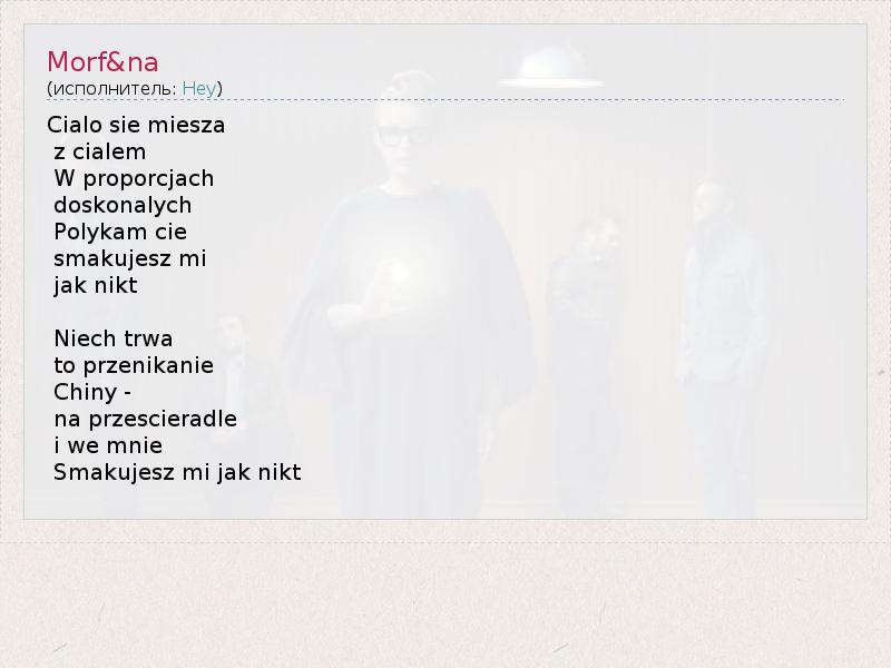 Это интересно:"Hey" - польская рок-группа, основанная в городе Шецине в 1992 году гитаристом Петром Банахом и харизматичной воклисткой Касей Носовской. Группа с начала 90ых годов является одной из самых популярных в Польше.Несмотря на то, что "Hey" описывают свой стиль как первая польская группа, играющая в стиле гранж, их мелодичный, гитарный рок и эклектичное выступление попадает под влияние... продолжение