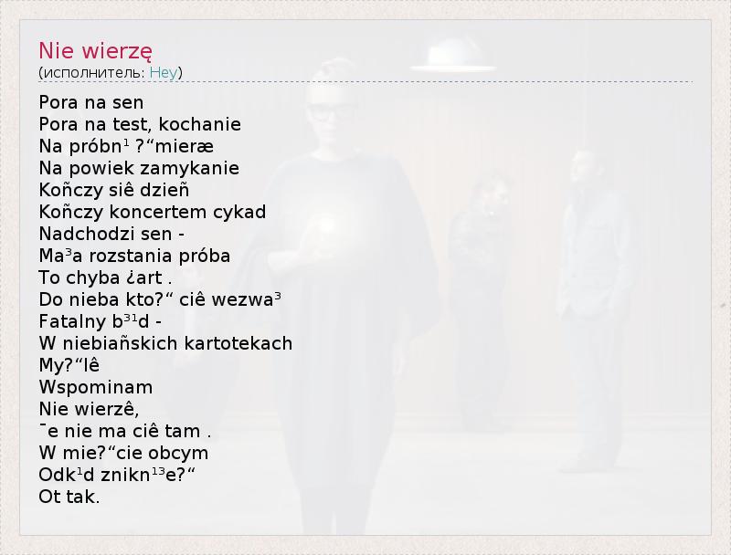 Это интересно:"Hey" - польская рок-группа, основанная в городе Шецине в 1992 году гитаристом Петром Банахом и харизматичной воклисткой Касей Носовской. Группа с начала 90ых годов является одной из самых популярных в Польше.Несмотря на то, что "Hey" описывают свой стиль как первая польская группа, играющая в стиле гранж, их мелодичный, гитарный рок и эклектичное выступление попадает под влияние... продолжение