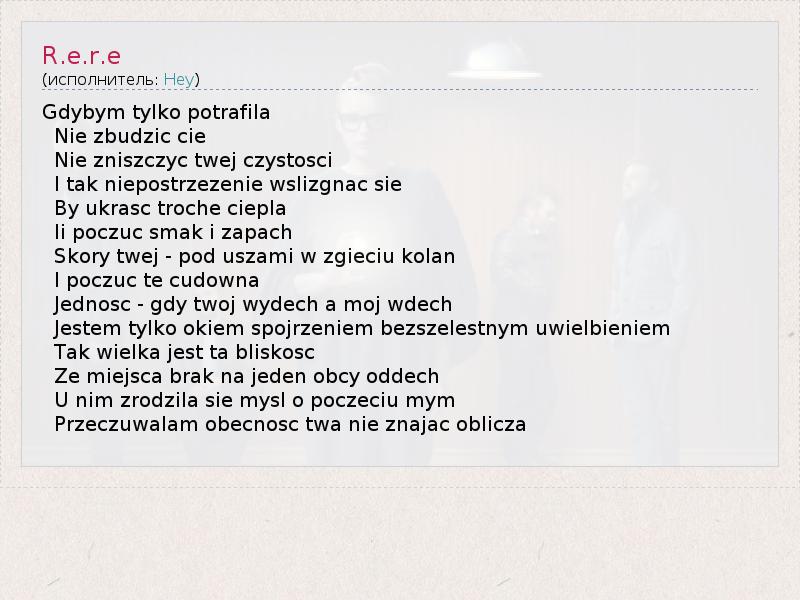 Это интересно:"Hey" - польская рок-группа, основанная в городе Шецине в 1992 году гитаристом Петром Банахом и харизматичной воклисткой Касей Носовской. Группа с начала 90ых годов является одной из самых популярных в Польше.Несмотря на то, что "Hey" описывают свой стиль как первая польская группа, играющая в стиле гранж, их мелодичный, гитарный рок и эклектичное выступление попадает под влияние... продолжение