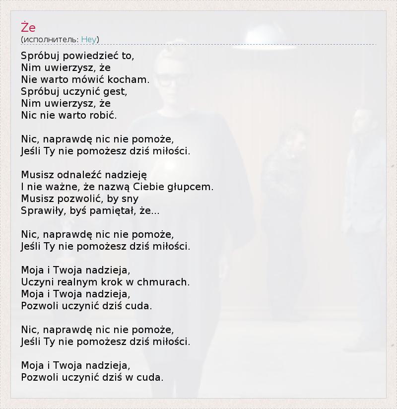 Spróbuj powiedzieć чтобы , Ним uwierzysz , że Nie Warto mówić Kocham . Spróbuj uczynić гест , Ним uwierzysz , że Ник ние Warto Robić . Ник , naprawdę Исполнителя некоммерческого характера pomoże , Jeśli Ты ние pomożesz dziś miłości . Musisz odnaleźć nadzieję Я Nie Важная , że Nazwa Ciebie głupcem . Musisz pozwolić , по сны Sprawiły , Bys pamiętał , З. ... Ник , naprawdę Исполнителя некоммерческого характера pomoże , Jeśli Ты ние pomożesz dziś miłości . Moja я Twoja nadzieja , Uczyni realnym Крок ж chmurach . Moja я Twoja nadzieja , Pozwoli uczynić dziś CUDA . Ник , naprawdę Исполнителя некоммерческого характера pomoże , Jeśli Ты ние pomożesz dziś miłości . Moja я Twoja nadzieja , Pozwoli uczynić dziś ж CUDA.
