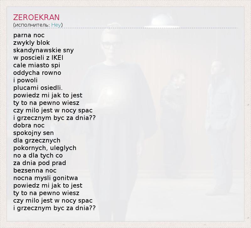 Это интересно:"Hey" - польская рок-группа, основанная в городе Шецине в 1992 году гитаристом Петром Банахом и харизматичной воклисткой Касей Носовской. Группа с начала 90ых годов является одной из самых популярных в Польше.Несмотря на то, что "Hey" описывают свой стиль как первая польская группа, играющая в стиле гранж, их мелодичный, гитарный рок и эклектичное выступление попадает под влияние... продолжение