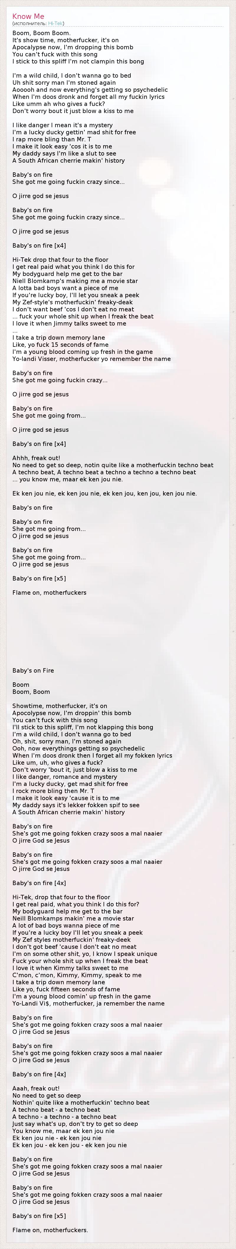 Boom, Boom Boom. It's show time, motherfucker, it's on Apocalypse now, I'm dropping this bomb You can't fuck with this song I stick to this spliff I'm not clampin this bong I'm a wild child, I don't wanna go to bed Uh shit sorry man I'm stoned again Aooooh and now everything's getting so psychedelic When I'm doos dronk and forget all my fuckin lyrics Like umm ah who gives a fuck? Don't worry bout it just blow a kiss to me I like danger I mean it's a mystery I'm a lucky ducky gettin' mad shit for free I rap more bling than Mr. T I make it look easy 'cos it is to me My daddy says I'm like a slut to see A South African cherrie makin' history Baby's on fire She got me going fuckin crazy since... O jirre god se jesus Baby's on fire She got me going fuckin crazy since... O jirre god se jesus Baby's on fire [x4] Hi-Tek drop that four to the floor I get real paid what you think I do this for My bodyguard help me get to the bar Niell Blomkamp's making me a movie star A lotta bad boys want a piece of me If you're lucky boy, I'll let you sneak a peek My Zef-style's motherfuckin' freaky-deak I don't want beef 'cos I don't eat no meat ... fuck your whole shit up when I freak the beat I love it when Jimmy talks sweet to me ... I take a trip down memory lane Like, yo fuck 15 seconds of fame I'm a young blood coming up fresh in the game Yo-landi Visser, motherfucker yo remember the name Baby's on fire She got me going fuckin crazy... O jirre god se jesus Baby's on fire She got me going from... O jirre god se jesus Baby's on fire [x4] Ahhh, freak out! No need to get so deep, notin quite like a motherfuckin techno beat A techno beat, A techno beat a techno a techno a techno beat ... you know me, maar ek ken jou nie. Ek ken jou nie, ek ken jou nie, ek ken jou, ken jou, ken jou nie. Baby's on fire Baby's on fire She got me going from... O jirre god se jesus Baby's on fire She got me going from... O jirre god se jesus Baby's on fire [x5] Flame on, motherfuckers Baby's on Fire Boom Boom, Boom Showtime, motherfucker, it's on Apocolypse now, I'm droppin' this bomb You can't fuck with this song I'll stick to this spliff, I'm not klapping this bong I'm a wild child, I don't wanna go to bed Oh, shit, sorry man, I'm stoned again Ooh, now everythings getting so psychedelic When I'm doos dronk then I forget all my fokken lyrics Like um, uh, who gives a fuck? Don't worry 'bout it, just blow a kiss to me I like danger, romance and mystery I'm a lucky ducky, get mad shit for free I rock more bling then Mr. T I make it look easy 'cause it is to me My daddy says it's lekker fokken spif to see A South African cherrie makin' history Baby's on fire She's got me going fokken crazy soos a mal naaier O jirre God se Jesus Baby's on fire She's got me going fokken crazy soos a mal naaier O jirre God se Jesus Baby's on fire [4x] Hi-Tek, drop that four to the floor I get real paid, what you think I do this for? My bodyguard help me get to the bar Neill Blomkamps makin' me a movie star A lot of bad boys wanna piece of me If you're a lucky boy I'll let you sneak a peek My Zef styles motherfuckin' freaky-deek I don't got beef 'cause I don't eat no meat I'm on some other shit, yo, I know I speak unique Fuck your whole shit up when I freak the beat I love it when Kimmy talks sweet to me C'mon, c'mon, Kimmy, Kimmy, speak to me I take a trip down memory lane Like yo, fuck fifteen seconds of fame I'm a young blood comin' up fresh in the game Yo-Landi Vi$, motherfucker, ja remember the name Baby's on fire She's got me going fokken crazy soos a mal naaier O jirre God se Jesus Baby's on fire She's got me going fokken crazy soos a mal naaier O jirre God se Jesus Baby's on fire [4x] Aaah, freak out! No need to get so deep Nothin' quite like a motherfuckin' techno beat A techno beat - a techno beat A techno - a techno - a techno beat Just say what's up, don't try to get so deep You know me, maar ek ken jou nie Ek ken jou nie - ek ken jou nie Ek ken jou - ek ken jou - ek ken jou nie Baby's on fire She's got me going fokken crazy soos a mal naaier O jirre God se Jesus Baby's on fire She's got me going fokken crazy soos a mal naaier O jirre God se Jesus Baby's on fire [x5] Flame on, motherfuckers.
