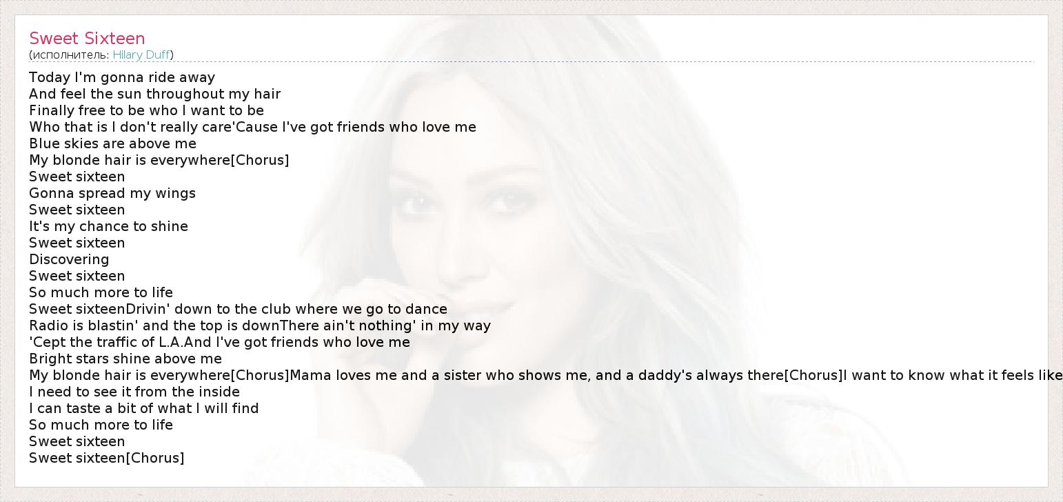 Today I'm gonna ride away And feel the sun throughout my hair Finally free to be who I want to be Who that is I don't really care'Cause I've got friends who love me Blue skies are above me My blonde hair is everywhere[Chorus] Sweet sixteen Gonna spread my wings Sweet sixteen It's my chance to shine Sweet sixteen Discovering Sweet sixteen So much more to life Sweet sixteenDrivin' down to the club where we go to dance Radio is blastin' and the top is downThere ain't nothing' in my way 'Cept the traffic of L.A.And I've got friends who love me Bright stars shine above me My blonde hair is everywhere[Chorus]Mama loves me and a sister who shows me, and a daddy's always there[Chorus]I want to know what it feels like I need to see it from the inside I can taste a bit of what I will find So much more to life Sweet sixteen Sweet sixteen[Chorus]