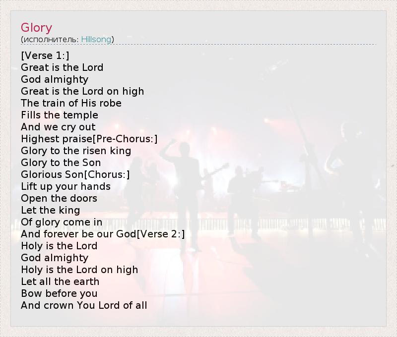 Это интересно:«Хиллсонг» (англ. Hillsong) — собирательное название для музыкальных групп, ведущих музыкальные служения (служение прославления) в церквях «Хиллсонг». Изначально название только одного музыкального коллектива в Австралии.
