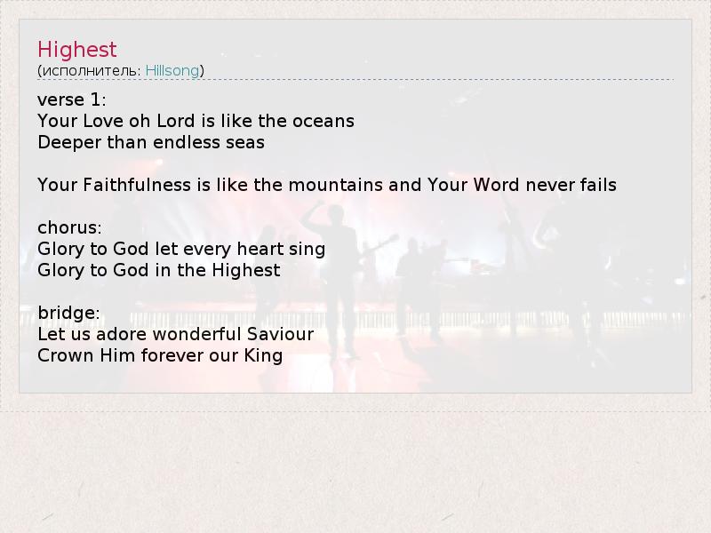 verse 1: Your Love oh Lord is like the oceans Deeper than endless seas Your Faithfulness is like the mountains and Your Word never fails chorus: Glory to God let every heart sing Glory to God in the Highest bridge: Let us adore wonderful Saviour Crown Him forever our King