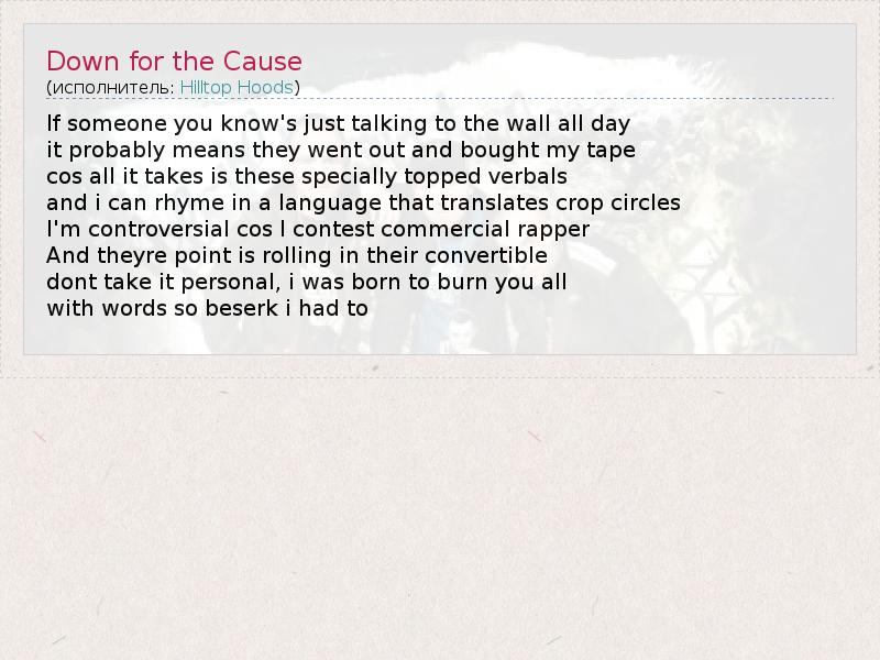 А как ты думаешь, о чем песня "Down for the Cause" ?