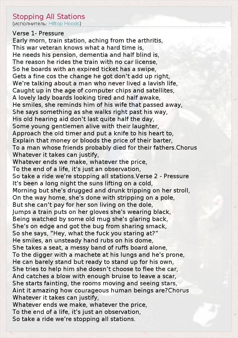 А как ты думаешь, о чем песня "Stopping All Stations" ?