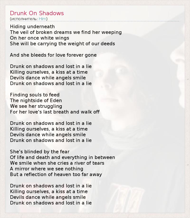 Скрывая себя Под вуалью несбывшихся надежд, она рыдает. На своих когда-то белых крыльях Она потянет груз наших деяний. И она истекает кровью за навсегда ушедшую любовь. Опьянённые тенями и потерявшиеся во лжи, Мы убиваем себя, каждый раз одним поцелуем. Демоны танцуют, а ангелы улыбаются. Опьянённые тенями и потерявшиеся во лжи... Она ищет души для скармливания Обратной стороне Рая. Мы видим, как она борется За последний вдох своей любви и уходит... Опьянённые тенями и потерявшиеся во лжи, Мы убиваем себя, каждый раз одним поцелуем. Демоны танцуют, а ангелы улыбаются. Опьянённые тенями и потерявшиеся во лжи... Она ослеплена страхом - Страхом жизни и смерти, и всего, что в промежутке. Мы улыбаемся, когда она изливает реки слез. В зеркале мы не видим ничего, кроме Отражения слишком далекого рая. Опьянённые тенями и потерявшиеся во лжи, Мы убиваем себя, каждый раз одним поцелуем. Демоны танцуют, а ангелы улыбаются. Опьянённые тенями и потерявшиеся во лжи...