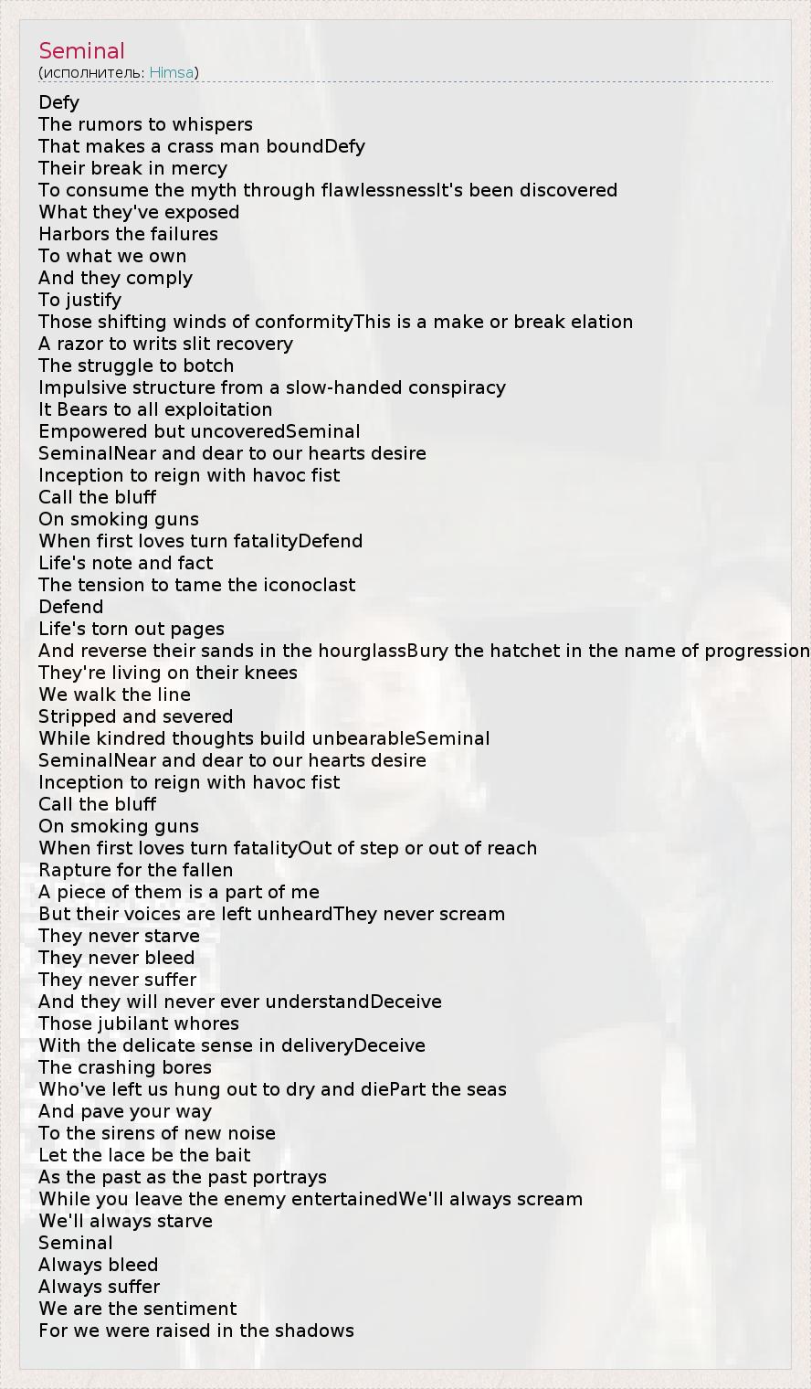 Это интересно:Himsa - американская группа из Сиэтла, штат Вашингтон, играющая смесь мелодичного дэт-метала с примесью металкора. Название Himsa происходит от слова "Ahimsa", что на санскрите означает "воздержаться от нанесения ущерба". Однако если убрать букву "A", слово принимает противоположное значение. "Himsa" означает "насилие" на санскрите и других индийских языках. Группа сформировалась... продолжение