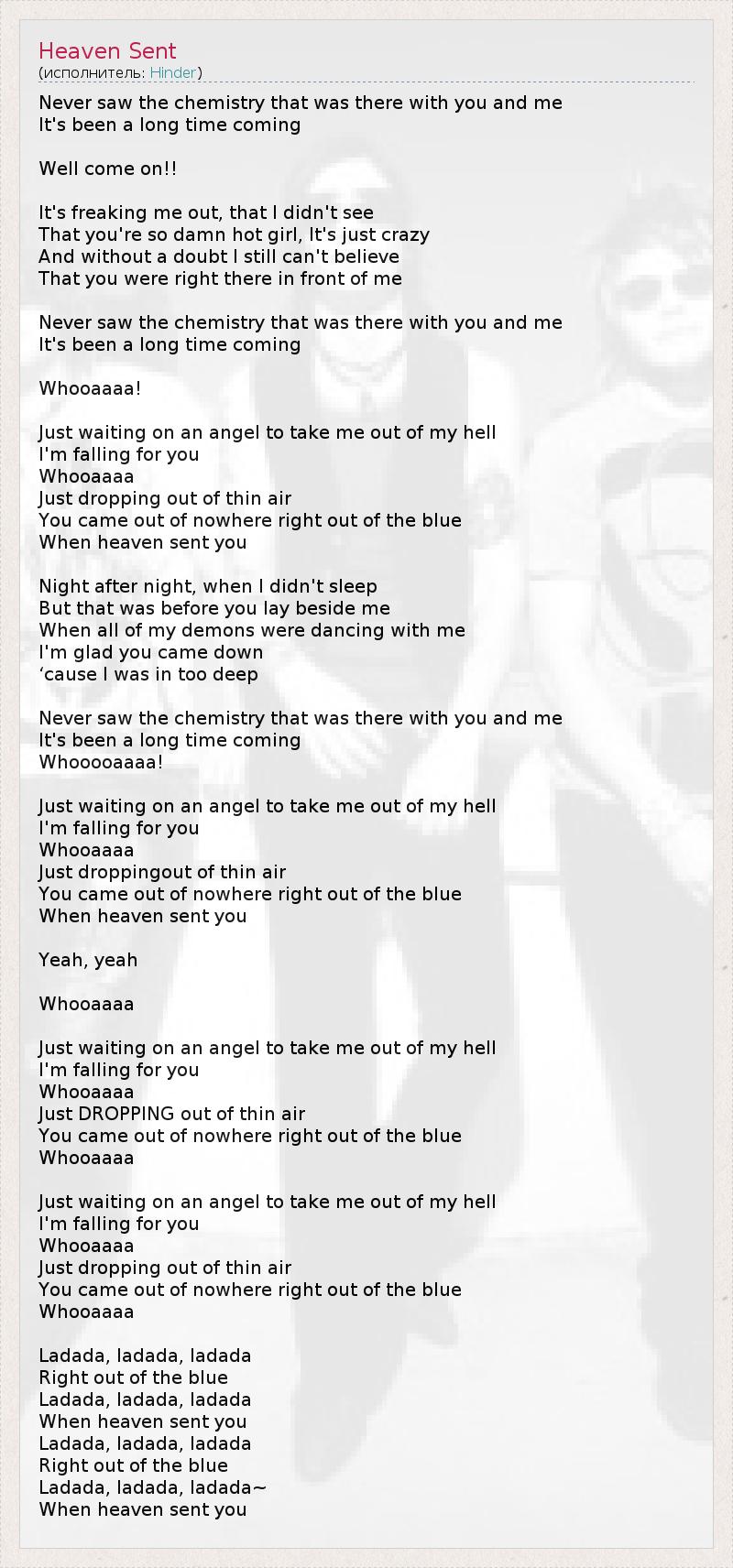 Never saw the chemistry that was there with you and me It's been a long time coming Well come on!! It's freaking me out, that I didn't see That you're so damn hot girl, It's just crazy And without a doubt I still can't believe That you were right there in front of me Never saw the chemistry that was there with you and me It's been a long time coming Whooaaaa! Just waiting on an angel to take me out of my hell I'm falling for you Whooaaaa Just dropping out of thin air You came out of nowhere right out of the blue When heaven sent you Night after night, when I didn't sleep But that was before you lay beside me When all of my demons were dancing with me I'm glad you came down ‘cause I was in too deep Never saw the chemistry that was there with you and me It's been a long time coming Whooooaaaa! Just waiting on an angel to take me out of my hell I'm falling for you Whooaaaa Just droppingout of thin air You came out of nowhere right out of the blue When heaven sent you Yeah, yeah Whooaaaa Just waiting on an angel to take me out of my hell I'm falling for you Whooaaaa Just DROPPING out of thin air You came out of nowhere right out of the blue Whooaaaa Just waiting on an angel to take me out of my hell I'm falling for you Whooaaaa Just dropping out of thin air You came out of nowhere right out of the blue Whooaaaa Ladada, ladada, ladada Right out of the blue Ladada, ladada, ladada When heaven sent you Ladada, ladada, ladada Right out of the blue Ladada, ladada, ladada~ When heaven sent you