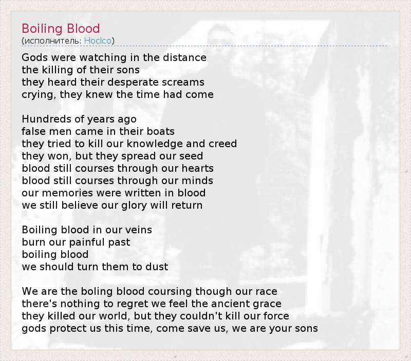Gods were watching in the distance the killing of their sons they heard their desperate screams crying, they knew the time had come Hundreds of years ago false men came in their boats they tried to kill our knowledge and creed they won, but they spread our seed blood still courses through our hearts blood still courses through our minds our memories were written in blood we still believe our glory will return Boiling blood in our veins burn our painful past boiling blood we should turn them to dust We are the boling blood coursing though our race there's nothing to regret we feel the ancient grace they killed our world, but they couldn't kill our force gods protect us this time, come save us, we are your sons