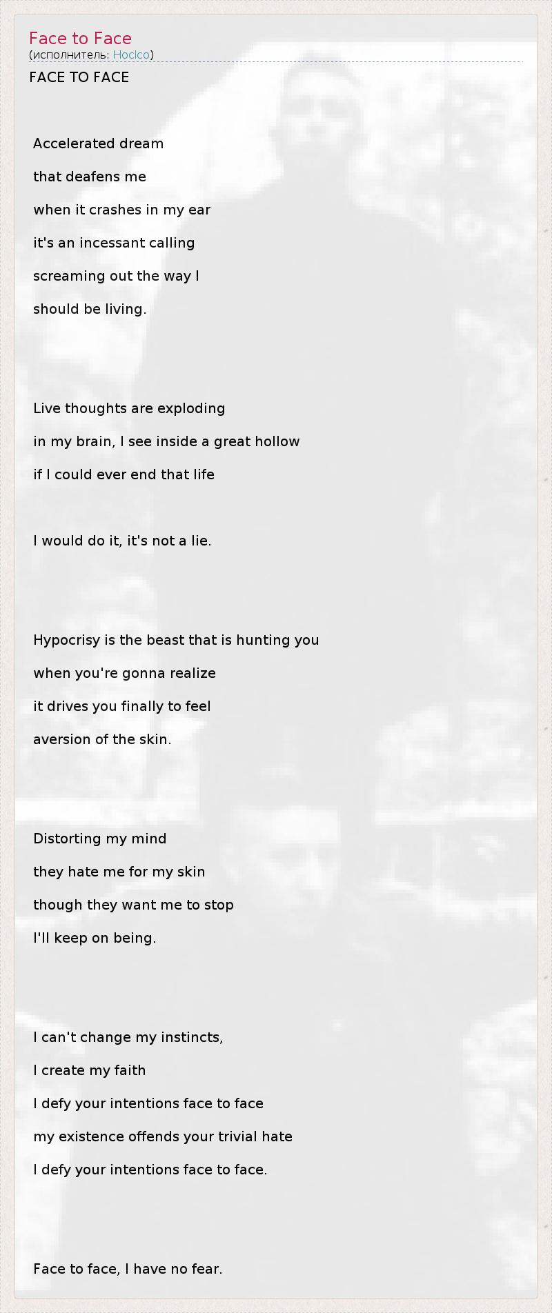 FACE TO FACE Accelerated dream that deafens me when it crashes in my ear it's an incessant calling screaming out the way I should be living. Live thoughts are exploding in my brain, I see inside a great hollow if I could ever end that life I would do it, it's not a lie. Hypocrisy is the beast that is hunting you when you're gonna realize it drives you finally to feel aversion of the skin. Distorting my mind they hate me for my skin though they want me to stop I'll keep on being. I can't change my instincts, I create my faith I defy your intentions face to face my existence offends your trivial hate I defy your intentions face to face. Face to face, I have no fear.